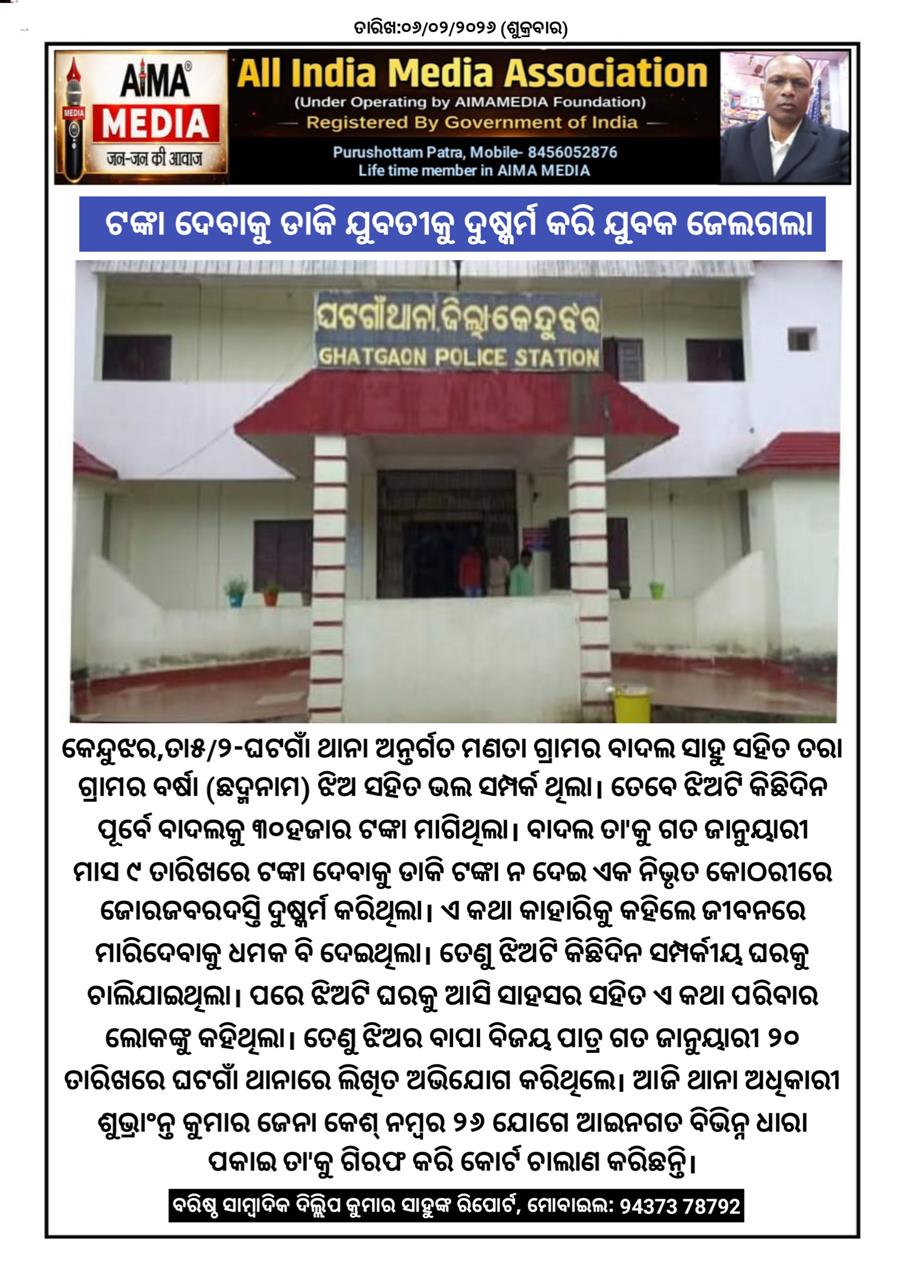 କେନ୍ଦୁଝର,ତା୫/୨-ଘଟଗାଁ ଥାନା ଅନ୍ତର୍ଗତ ମଣତା ଗ୍ରାମର ବାଦଲ ସାହୁ ସହିତ ତରା ଗ୍ରାମର ବର୍ଷା (ଛଦ୍ମନାମ) ଝିଅ ସହିତ ଭଲ ସମ୍ପର୍କ ଥିଲା। ତେବେ ଝିଅଟି କିଛିଦିନ ପୂର୍ବେ ବାଦଲକୁ ୩୦ହଜାର ଟଙ୍କା ମାଗିଥିଲା। ବାଦଲ ତା'କୁ ଗତ ଜାନୁୟାରୀ ମାସ ୯ ତାରିଖରେ ଟଙ୍କା ଦେବାକୁ ଡାକି ଟଙ୍କା ନ ଦେଇ ଏକ ନିଭୃତ କୋଠରୀରେ ଜୋରଜବରଦସ୍ତି ଦୁଷ୍କର୍ମ କରିଥିଲା। ଏ କଥା କାହାରିକୁ କହିଲେ ଜୀବନରେ ମାରିଦେବାକୁ ଧମକ ବି ଦେଇଥିଲା। ତେଣୁ ଝିଅଟି କିଛିଦିନ ସମ୍ପର୍କୀୟ ଘରକୁ ଚାଲିଯାଇଥିଲା। ପରେ ଝିଅଟି ଘରକୁ ଆସି ସାହସର ସହିତ ଏ କଥା ପରିବାର ଲୋକଙ୍କୁ କହିଥିଲା। ତେଣୁ ଝିଅର ବାପା ବିଜୟ ପାତ୍ର ଗତ ଜାନୁୟାରୀ ୨୦ ତାରିଖରେ ଘଟଗାଁ ଥାନାରେ ଲିଖିତ ଅଭିଯୋଗ କରିଥିଲେ। ଆଜି ଥାନା ଅଧିକାରୀ ଶୁଭ୍ରାଂନ୍ତ କୁମାର ଜେନା କେଶ୍ ନମ୍ବର ୨୬ ଯୋଗେ ଆଇନଗତ ବିଭିନ୍ନ ଧାରା ପକାଇ ତା'କୁ ଗିରଫ କରି କୋର୍ଟ ଚାଲାଣ କରିଛନ୍ତି।
