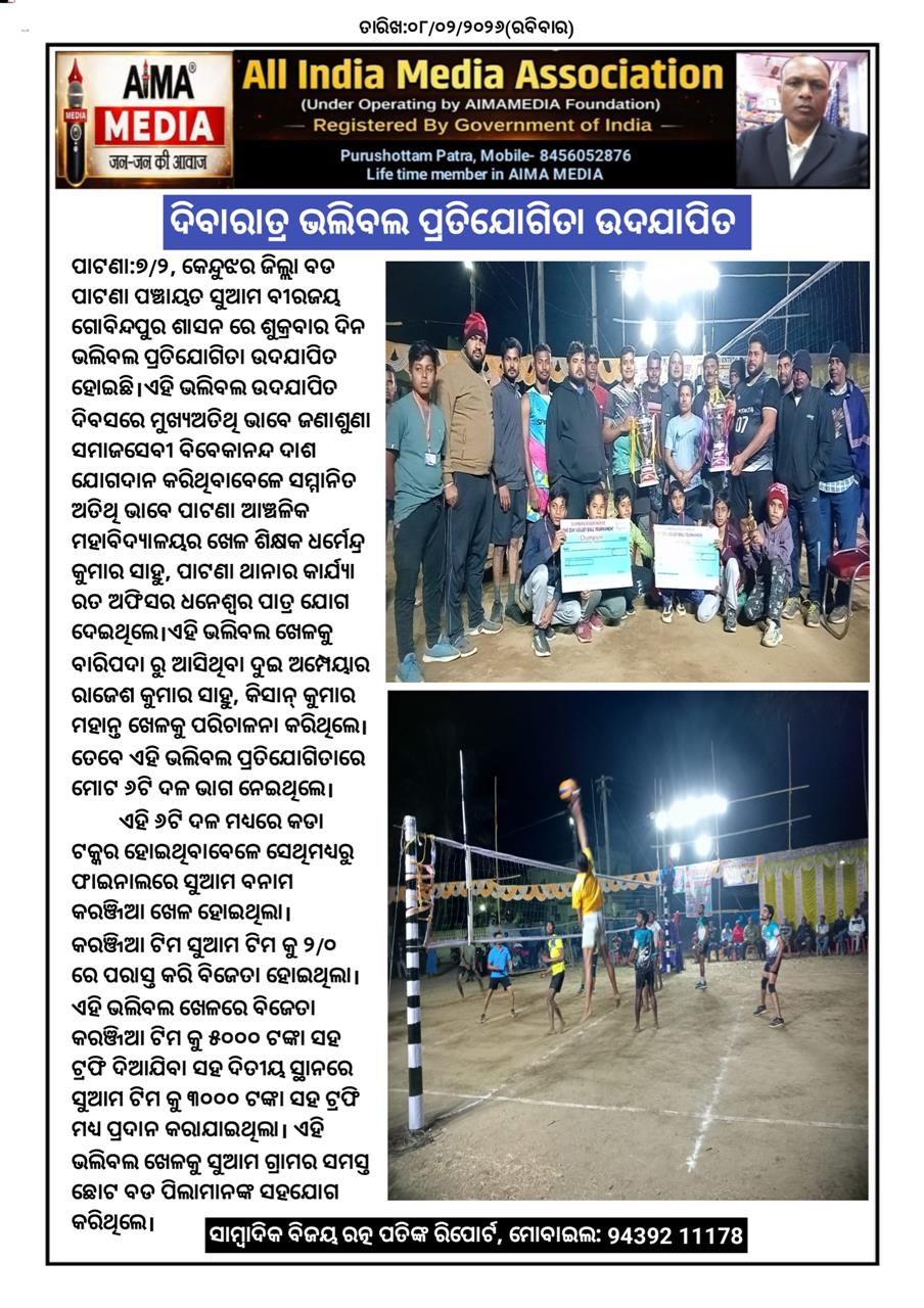 ପାଟଣା:୭/୨, କେନ୍ଦୁଝର ଜିଲ୍ଲା ବଡ ପାଟଣା ପଞ୍ଚାୟତ ସୁଆମ ବୀରଜୟ ଗୋବିନ୍ଦପୁର ଶାସନ ରେ ଶୁକ୍ରବାର ଦିନ ଭଲିବଲ ପ୍ରତିଯୋଗିତା ଉଦଯାପିତ ହୋଇଛି। ଏହି ଭଲିବଲ ଉଦଯାପିତ ଦିବସରେ ମୁଖ୍ୟଅତିଥି ଭାବେ ଜଣାଶୁଣା ସମାଜସେବୀ ବିବେକାନନ୍ଦ ଦାଶ ଯୋଗଦାନ କରିଥିବାବେଳେ ସମ୍ମାନିତ ଅତିଥି ଭାବେ ପାଟଣା ଆଞ୍ଚଳିକ ମହାବିଦ୍ୟାଳୟର ଖେଳ ଶିକ୍ଷକ ଧର୍ମେନ୍ଦ୍ର କୁମାର ସାହୁ, ପାଟଣା ଥାନାର କାର୍ଯ୍ୟା ରତ ଅଫିସର ଧନେଶ୍ୱର ପାତ୍ର ଯୋଗ ଦେଇଥିଲେ। ଏହି ଭଲିବଲ ଖେଳକୁ ବାରିପଦା ରୁ ଆସିଥିବା ଦୁଇ ଅମ୍ପେୟାର ରାଜେଶ କୁମାର ସାହୁ, କିସାନ୍ କୁମାର ମହାନ୍ତ ଖେଳକୁ ପରିଚାଳନା କରିଥିଲେ। ତେବେ ଏହି ଭଲିବଲ ପ୍ରତିଯୋଗିତାରେ ମୋଟ ୬ଟି ଦଳ ଭାଗ ନେଇଥିଲେ।