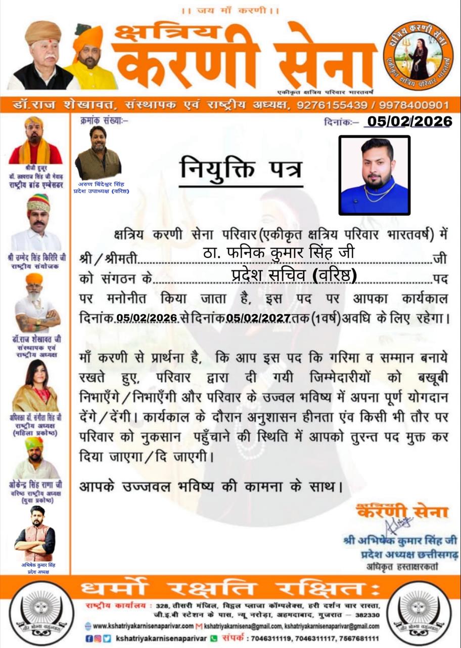 ​क्षत्रिय करणी सेना परिवार (एकीकृत क्षत्रिय परिवार भारतवर्ष) ने छत्तीसगढ़ में अपने संगठन को मजबूती प्रदान करने के उद्देश्य से नई नियुक्तियों की घोषणा की है। इसी कड़ी में, मूल रूप से चिरमिरी (पोड़ी) के निवासी और वर्तमान में रायपुर में सक्रिय कुशल युवा व्यवसाई श्री फनिक सिंह को संगठन में प्रदेश सचिव (वरिष्ठ) के महत्वपूर्ण पद पर मनोनीत किया गया है। संगठन द्वारा जारी आधिकारिक पत्र के अनुसार, श्री फनिक सिंह की यह नियुक्ति 05 फरवरी, 2026 से प्रभावी हो गई है। उनका यह कार्यकाल 05 फरवरी, 2027 तक, एक वर्ष की अवधि के लिए रहेगा। प्रदेश अध्यक्ष (छत्तीसगढ़) श्री अभिषेक कुमार सिंह के हस्ताक्षरों से यह नियुक्ति पत्र जारी किया गया है।