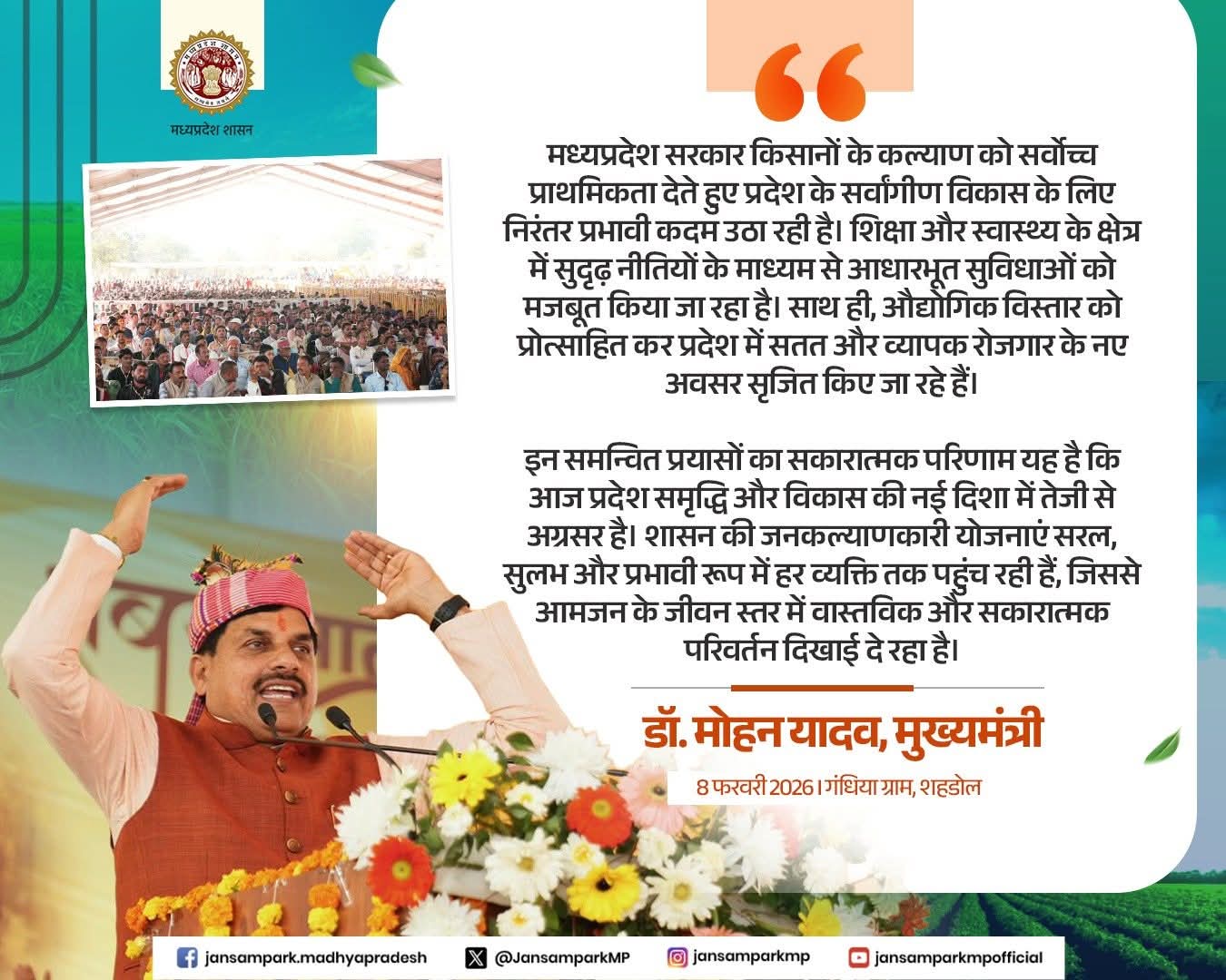 मध्यप्रदेश सरकार किसानों के कल्याण को सर्वोच्च प्राथमिकता देते हुए प्रदेश के सर्वांगीण विकास के लिए निरंतर प्रभावी कदम उठा रही है। शिक्षा और स्वास्थ्य के क्षेत्र में सुदृढ़ नीतियों के माध्यम से आधारभूत सुविधाओं को मजबूत किया जा रहा है। साथ ही, औद्योगिक विस्तार को प्रोत्साहित कर प्रदेश में सतत और व्यापक रोजगार के नए अवसर सृजित किए जा रहे हैं।