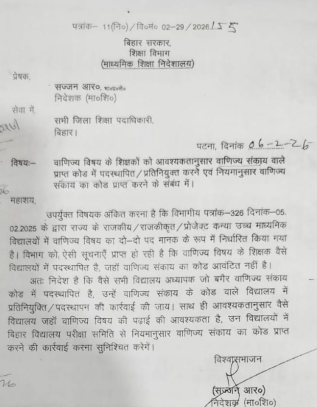 पटना, 6 फरवरी 2026 — बिहार सरकार के शिक्षा विभाग (माध्यमिक शिक्षा निदेशालय) ने राज्य के सभी जिला शिक्षा पदाधिकारियों को महत्वपूर्ण निर्देश जारी किया है। विभाग ने स्पष्ट किया है कि वाणिज्य (कॉमर्स) विषय के शिक्षकों की तैनाती आवश्यकता के अनुरूप वाणिज्य संकाय वाले विद्यालयों में सुनिश्चित की जाए।