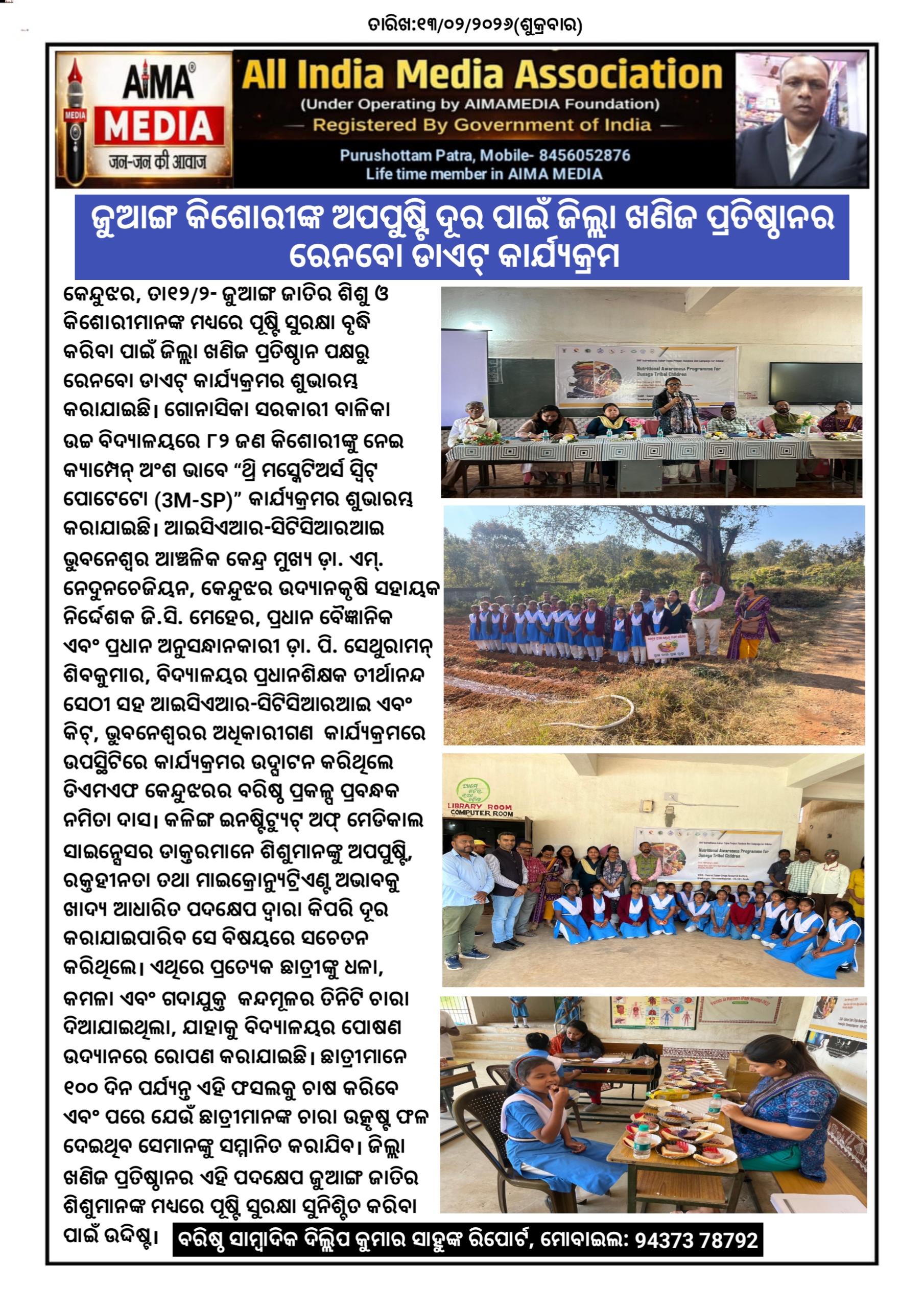 କେନ୍ଦୁଝର,ତା୧୨/୨- ଜୁଆଙ୍ଗ ଜାତିର ଶିଶୁ ଓ କିଶୋରୀମାନଙ୍କ ମଧ୍ୟରେ ପୂଷ୍ଟି ସୁରକ୍ଷା ବୃଦ୍ଧି କରିବା ପାଇଁ ଜିଲ୍ଲା ଖଣିଜ ପ୍ରତିଷ୍ଠାନ ପକ୍ଷରୁ ରେନବୋ ଡାଏଟ୍ କାର୍ଯ୍ୟକ୍ରମର ଶୁଭାରମ୍ଭ କରାଯାଇଛି। ଗୋନାସିକା ସରକାରୀ ବାଳିକା ଉଚ୍ଚ ବିଦ୍ୟାଳୟରେ ୮୨ ଜଣ କିଶୋରୀଙ୍କୁ ନେଇ କ୍ୟାମ୍ପେନ୍ ଅଂଶ ଭାବେ “ଥ୍ରି ମସ୍କେଟିଅର୍ସ ସ୍ୱିଟ୍ ପୋଟେଟୋ (3M-SP)” କାର୍ଯ୍ୟକ୍ରମର ଶୁଭାରମ୍ଭ କରାଯାଇଛି।ଆଇସିଏଆର-ସିଟିସିଆରଆଇ ଭୁବନେଶ୍ୱର ଆଞ୍ଚଳିକ କେନ୍ଦ୍ର ମୁଖ୍ୟ ଡ଼ା. ଏମ୍. ନେଦୁନଚେଜିୟନ, କେନ୍ଦୁଝର ଉଦ୍ୟାନକୃଷି ସହାୟକ ନିର୍ଦ୍ଦେଶକ ଜି.ସି. ମେହେର, ପ୍ରଧାନ ବୈଜ୍ଞାନିକ ଏବଂ ପ୍ରଧାନ ଅନୁସନ୍ଧାନକାରୀ ଡ଼ା. ପି. ସେଥୁରାମନ୍ ଶିବକୁମାର, ବିଦ୍ୟାଳୟର ପ୍ରଧାନଶିକ୍ଷକ ତୀର୍ଥାନନ୍ଦ ସେଠୀ ସହ ଆଇସିଏଆର-ସିଟିସିଆରଆଇ ଏବଂ କିଟ୍, ଭୁବନେଶ୍ୱରର ଅଧିକାରୀଗଣ କାର୍ଯ୍ୟକ୍ରମରେ ଉପସ୍ଥିଟିରେ କାର୍ଯ୍ୟକ୍ରମର ଉଦ୍ଘାଟନ କରିଥିଲେ ଡିଏମଏଫ କେନ୍ଦୁଝରର ବରିଷ୍ଠ ପ୍ରକଳ୍ପ ପ୍ରବନ୍ଧକ ନମିତା ଦାସ। କଳିଙ୍ଗ ଇନଷ୍ଟିଟ୍ୟୁଟ୍ ଅଫ୍ ମେଡିକାଲ ସାଇନ୍ସେସର ଡାକ୍ତରମାନେ ଶିଶୁମାନଙ୍କୁ ଅପପୁଷ୍ଟି, ରକ୍ତହୀନତା ତଥା ମାଇକ୍ରୋନ୍ୟୁଟ୍ରିଏଣ୍ଟ ଅଭାବକୁ ଖାଦ୍ୟ ଆଧାରିତ ପଦକ୍ଷେପ ଦ୍ୱାରା କିପରି ଦୂର କରାଯାଇପାରିବ ସେ ବିଷୟରେ ସଚେତନ କରିଥିଲେ। ଏଥିରେ ପ୍ରତ୍ୟେକ ଛାତ୍ରୀଙ୍କୁ ଧଳା, କମଳା ଏବଂ ଗଦାଯୁକ୍ତ କନ୍ଦମୂଳର ତିନିଟି ଚାରା ଦିଆଯାଇଥିଲା, ଯାହାକୁ ବିଦ୍ୟାଳୟର ପୋଷଣ ଉଦ୍ୟାନରେ ରୋପଣ କରାଯାଇଛି। ଛାତ୍ରୀମାନେ ୧୦୦ ଦିନ ପର୍ଯ୍ୟନ୍ତ ଏହି ଫସଲକୁ ଚାଷ କରିବେ ଏବଂ ପରେ ଯେଉଁ ଛାତ୍ରୀମାନଙ୍କ ଚାରା ଉତ୍କୃଷ୍ଟ ଫଳ ଦେଇଥିବ ସେମାନଙ୍କୁ ସମ୍ମାନିତ କରାଯିବ। ଜିଲ୍ଲା ଖଣିଜ ପ୍ରତିଷ୍ଠାନର ଏହି ପଦକ୍ଷେପ ଜୁଆଙ୍ଗ ଜାତିର ଶିଶୁମାନଙ୍କ ମଧ୍ୟରେ ପୂଷ୍ଟି ସୁରକ୍ଷା ସୁନିଶ୍ଚିତ କରିବା ପାଇଁ ଉଦ୍ଦିଷ୍ଟ।