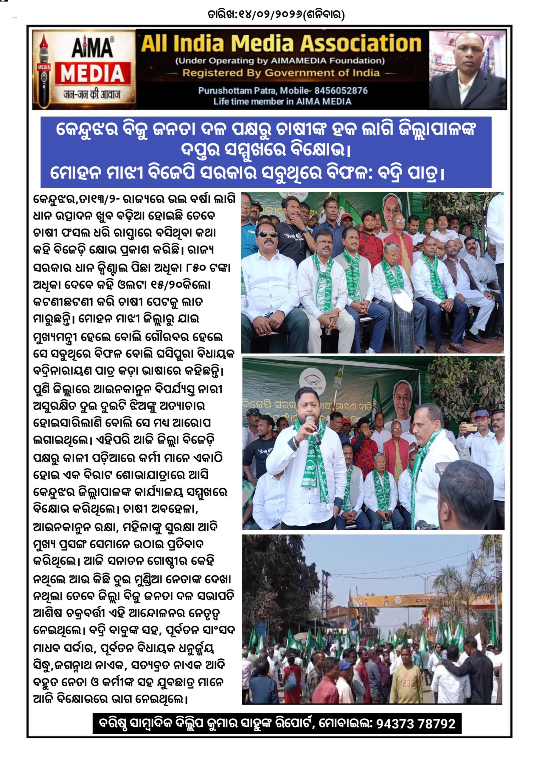 କେନ୍ଦୁଝର ବିଜୁ ଜନତା ଦଳ ପକ୍ଷରୁ ଚାଷୀଙ୍କ ହକ ଲାଗି ଜିଲ୍ଲାପାଳଙ୍କ ଦପ୍ତର ସମ୍ମୁଖରେ ବିକ୍ଷୋଭ।