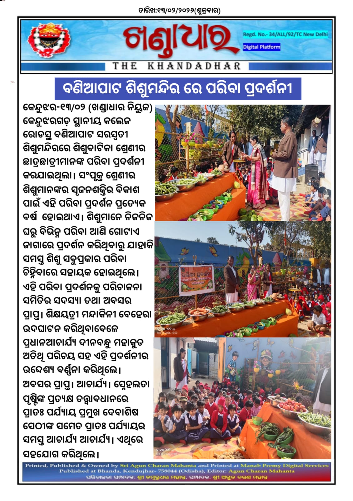 କେନ୍ଦୁଝରଗଡ଼ ସ୍ଥାନୀୟ କଲେଜ ରୋଡସ୍ଥ ବଣିଆପାଟ ସରସ୍ଵତୀ ଶିଶୁମନ୍ଦିରରେ ଶିଶୁବାଟିକା ଶ୍ରେଣୀର ଛାତ୍ରଛାତ୍ରୀମାନଙ୍କ ପରିବା ପ୍ରଦର୍ଶନୀ କରଯାଇଥିଲା । ସଂପୃକ୍ତ ଶ୍ରେଣୀର ଶିଶୁମାନଙ୍କର ସୃଜନଶକ୍ତିର ବିକାଶ ପାଇଁ ଏହି ପରିବା ପ୍ରଦର୍ଶନ ପ୍ରତ୍ୟେକ ବର୍ଷ ହୋଇଥାଏ । ଶିଶୁମାନେ ନିଜନିଜ ଘରୁ ବିଭିନ୍ନ ପରିବା ଆଣି ଗୋଟାଏ ଜାଗାରେ ପ୍ରଦର୍ଶନ କରିଥିବାରୁ ଯାହାକି ସମସ୍ତ ଶିଶୁ ସବୁପ୍ରକାର ପରିବା ଚିହ୍ନିବାରେ ସହାୟକ ହୋଇଥିଲେ । ଏହି ପରିବା ପ୍ରଦର୍ଶନକୁ ପରିଚାଳନା ସମିତିର ସଦସ୍ୟା ତଥା ଅବସର ପ୍ରାପ୍ତ। ଶିକ୍ଷୟତ୍ରୀ ମନ୍ଦାକିନୀ ବେହେରା ଉଦଘାଟନ କରିଥିବାବେଳେ ପ୍ରଧାନଆଚାର୍ଯ୍ୟ ଦୀନବନ୍ଧୁ ମହାକୁଡ ଅତିଥି ପରିଚୟ ସହ ଏହି ପ୍ରଦର୍ଶନୀର ଉଦ୍ଦେଶ୍ୟ ବର୍ଣ୍ଣନା କରିଥିଲେ । ଅବସର ପ୍ରାପ୍ତ। ଆଚାର୍ଯ୍ୟ। ସ୍ନେହଲତା ପୃଷ୍ଟିଙ୍କ ପ୍ରତ୍ଯକ୍ଷ ତତ୍ତ୍ବାବଧାନରେ ପ୍ରାତଃ ପର୍ଯ୍ୟାୟ ପ୍ରମୁଖ ଦେବାଶିଷ ସେଠୀଙ୍କ ସମେତ ପ୍ରାତଃ ପର୍ଯ୍ୟାୟର ସମସ୍ତ ଆଚାର୍ଯ୍ୟ ଆଚାର୍ଯ୍ୟ। ଏଥିରେ ସହଯୋଗ କରିଥିଲେ ।