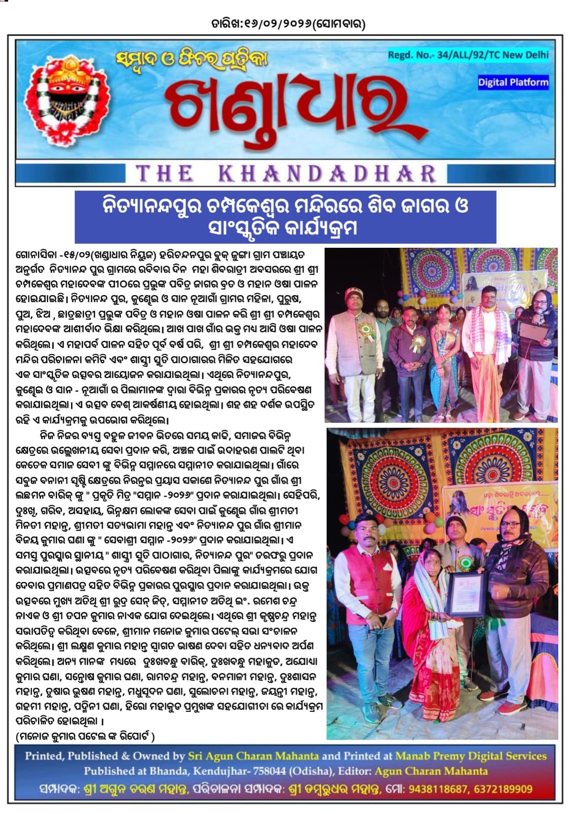 ନିଜ ନିଜର ବ୍ୟସ୍ତ ବହୁଳ ଜୀବନ ଭିତରେ ସମୟ କାଢି, ସମାଜର ବିଭିନ୍ନ କ୍ଷେତ୍ରରେ ଉଲ୍ଲେଖନୀୟ ସେବା ପ୍ରଦାନ କରି, ଅଞ୍ଚଳ ପାଇଁ ଉଦାହରଣ ପାଲଟି ଥିବା କେତେକ ସମାଜ ସେବୀ ଙ୍କୁ ବିଭିନ୍ନ ସମ୍ମାନରେ ସମ୍ମାନୀତ କରାଯାଇଥିଲା। ଗାଁରେ ସବୁଜ ବନାନୀ ସୃଷ୍ଟି କ୍ଷେତ୍ରରେ ନିରନ୍ତର ପ୍ରୟାସ ସକାଶେ ନିତ୍ୟାନନ୍ଦ ପୁର ଗାଁର ଶ୍ରୀ ଲଛମନ ବାରିକ୍ ଙ୍କୁ " ପ୍ରକୃତି ମିତ୍ର "ସମ୍ମାନ -୨୦୨୬" ପ୍ରଦାନ କରାଯାଇଥିଲା। ସେହିପରି, ଦୁଃଖି, ଗରିବ, ଅସହାୟ, ଭିନ୍ନକ୍ଷମ ଲୋକଙ୍କ ସେବା ପାଇଁ କୁଣ୍ଢେଇ ଗାଁର ଶ୍ରୀମତୀ ମିନତୀ ମହାନ୍ତ, ଶ୍ରୀମତୀ ସତ୍ୟଭାମା ମହାନ୍ତ ଏବଂ ନିତ୍ୟାନନ୍ଦ ପୁର ଗାଁର ଶ୍ରୀମାନ ବିଜୟ କୁମାର ଘଣା ଙ୍କୁ " ସେବାଶ୍ରୀ ସମ୍ମାନ -୨୦୨୬" ପ୍ରଦାନ କରାଯାଇଥିଲା। ଏ ସମସ୍ତ ପୁରସ୍କାର ସ୍ଥାନୀୟ " ଶାସ୍ତ୍ରୀ ସ୍ମୃତି ପାଠାଗାର, ନିତ୍ୟାନନ୍ଦ ପୁର" ତରଫରୁ ପ୍ରଦାନ କରାଯାଇଥିଲା। ଉତ୍ସବରେ ନୃତ୍ୟ ପରିବେଷଣ କରିଥିବା ପିଲାଙ୍କୁ କାର୍ଯ୍ୟକ୍ରମରେ ଯୋଗ ଦେବାର ପ୍ରମାଣପତ୍ର ସହିତ ବିଭିନ୍ନ ପ୍ରକାରର ପୁରସ୍କାର ପ୍ରଦାନ କରାଯାଇଥିଲା। ଉକ୍ତ ଉତ୍ସବରେ ମୁଖ୍ୟ ଅତିଥି ଶ୍ରୀ ରୁଦ୍ର ସେନ୍ ଜିତ୍, ସମ୍ମାନୀତ ଅତିଥି ଇଂ. ରମେଶ ଚନ୍ଦ୍ର ନାଏକ ଓ ଶ୍ରୀ ତପନ କୁମାର ନାଏକ ଯୋଗ ଦେଇଥିଲେ। ଏଥିରେ ଶ୍ରୀ କୃଷ୍ଣଚନ୍ଦ୍ର ମହାନ୍ତ ସଭାପତିତ୍ୱ କରିଥିବା ବେଳେ, ଶ୍ରୀମାନ ମନୋଜ କୁମାର ପଟେଲ୍ ସଭା ସଂଚାଳନ କରିଥିଲେ। ଶ୍ରୀ ଲକ୍ଷ୍ମଣ କୁମାର ମହାନ୍ତ ସ୍ବାଗତ ଭାଷଣ ଦେବା ସହିତ ଧନ୍ୟବାଦ ଅର୍ପଣ କରିଥିଲେ। ଅନ୍ୟ ମାନଙ୍କ ମଧ୍ୟରେ ଦୁଃଖବନ୍ଧୁ ବାରିକ୍, ଦୁଃଖବନ୍ଧୁ ମହାକୁଡ, ଅଯୋଧ୍ୟା କୁମାର ଘଣା, ସନ୍ତୋଷ କୁମାର ଘଣା, ରାମଚନ୍ଦ୍ର ମହାନ୍ତ, ବନମାଳୀ ମହାନ୍ତ, ଦୁଃଶାସନ ମହାନ୍ତ, ତୁଷାର ଭୁଷଣ ମହାନ୍ତ, ମଧୁସୂଦନ ଘଣା, ସୁଲୋଚନା ମହାନ୍ତ, ଜୟନ୍ତୀ ମହାନ୍ତ, ଗହମୀ ମହାନ୍ତ, ପଦ୍ମିନୀ ଘଣା, ହିରୋ ମହାକୁଡ ପ୍ରମୁଖଙ୍କ ସହଯୋଗୀତା ରେ କାର୍ଯ୍ୟକ୍ରମ ପରିଚାଳିତ ହୋଇଥିଲା ।