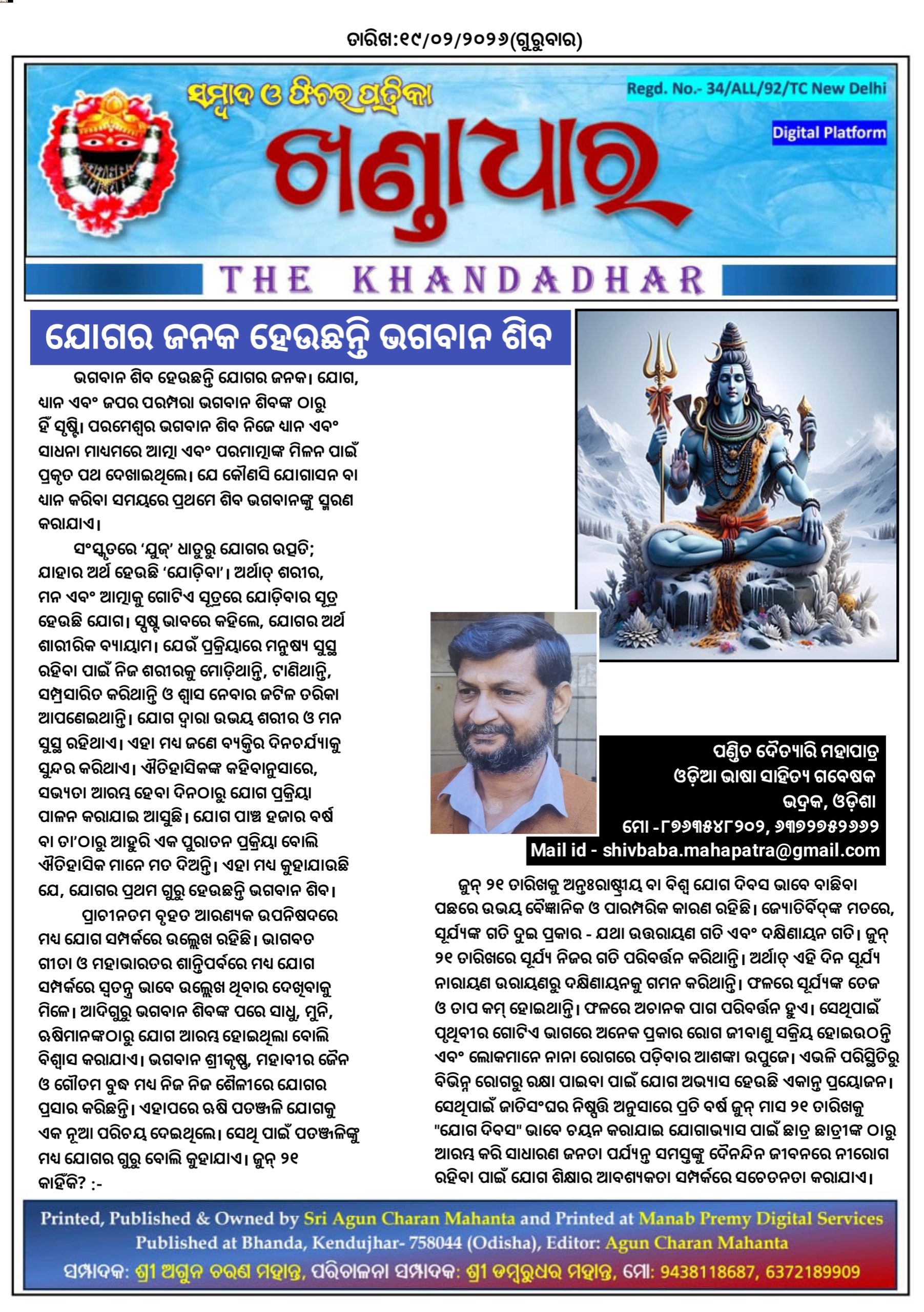 ଯୋଗର ଜନକ ହେଉଛନ୍ତି ଭଗବାନ ଶିବ- ପଣ୍ଡିତ ଦୈତାରୀ ମହାପାତ୍ର ଙ୍କ ବିଶେଷ ଉପସ୍ଥାପନା।