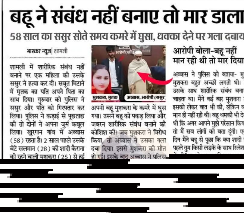 тАЛрд╡рд╛рд░рджрд╛рдд рдХреА рд╡рдЬрд╣: рдЖрд░реЛрдкреА рд╕рд╕реБрд░ рдЕрдмреНрдмрд╛рд╕ (58) рдЕрдкрдиреА рдмрд╣реВ рдореБрд╢рдХрд░рд╛ (25) рдкрд░ рд╢рд╛рд░реАрд░рд┐рдХ рд╕рдВрдмрдВрдз рдмрдирд╛рдиреЗ рдХреЗ рд▓рд┐рдП рджрдмрд╛рд╡ рдбрд╛рд▓ рд░рд╣рд╛ рдерд╛ред