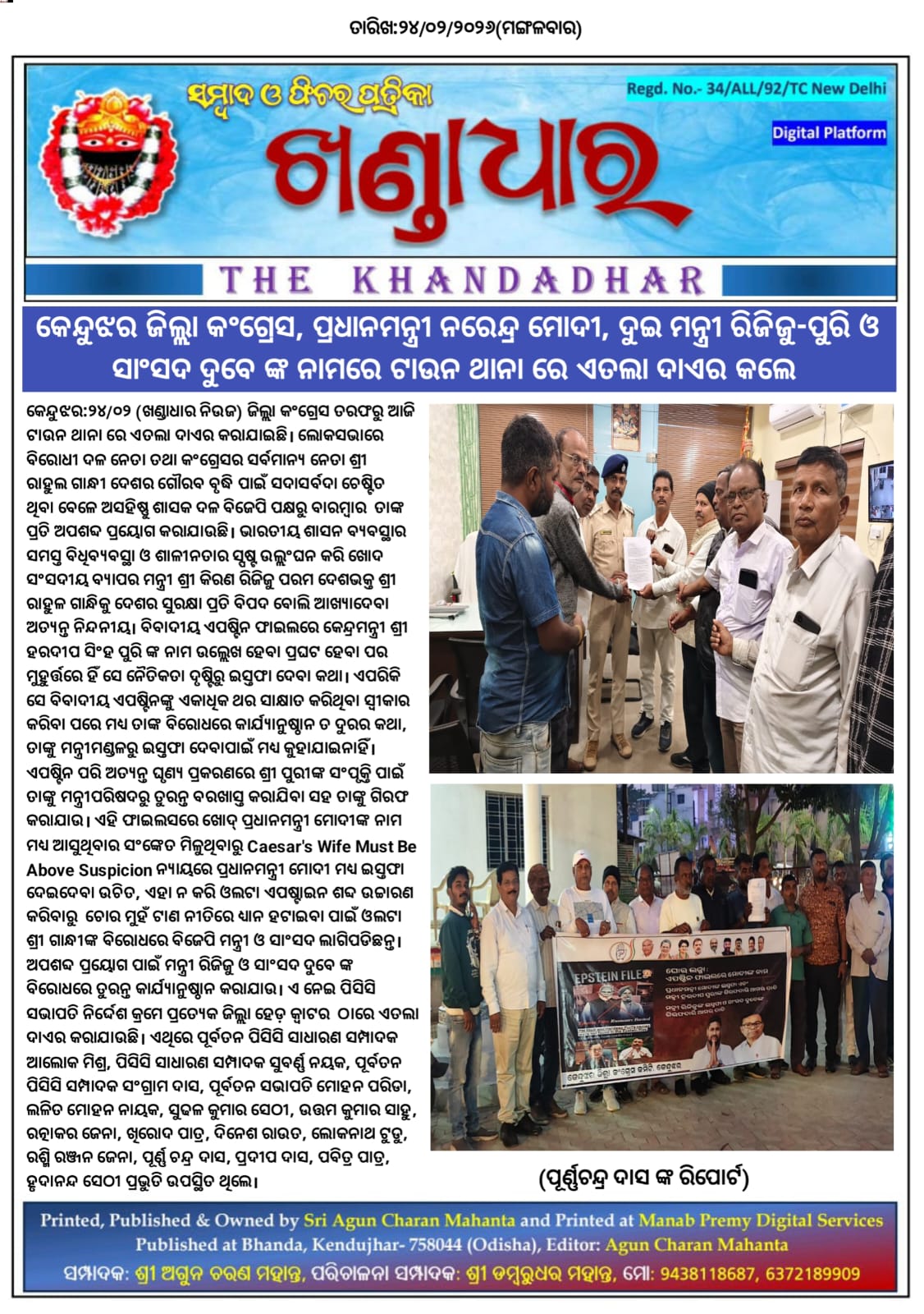 କେନ୍ଦୁଝର: ୨୪/୦୨, ଜିଲ୍ଲା କଂଗ୍ରେସ ତରଫରୁ ଆଜି ଟାଉନ ଥାନା ରେ ଏତଲା ଦାଏର କରାଯାଇଛି l ଲୋକସଭାରେ ବିରୋଧୀ ଦଳ ନେତା ତଥା କଂଗ୍ରେସର ସର୍ବମାନ୍ୟ ନେତା ଶ୍ରୀ ରାହୁଲ ଗାନ୍ଧୀ ଦେଶର ଗୌରବ ବୃଦ୍ଧି ପାଇଁ ସଦାସର୍ବଦା ଚେଷ୍ଟିତ ଥିବା ବେଳେ ଅସହିଷ୍ଟୁଶାସକ ଦଳ ବିଜେପି ପକ୍ଷରୁ ବାରମ୍ବାର ତାଙ୍କ ପ୍ରତି ଅପଶବ୍ଦ ପ୍ରୟୋଗ କରାଯାଉଛି l ଭାରତୀୟ ଶାସନ ବ୍ୟବସ୍ଥାର ସମସ୍ତ ବିଧିବ୍ୟବସ୍ଥା ଓ ଶାଳୀନତାର ସ୍ପଷ୍ଟ ଉଲ୍ଲଂଘନ କରି ଖୋଦ ସଂସଦୀୟ ବ୍ୟାପର ମନ୍ତ୍ରୀ ଶ୍ରୀ କିରଣ ରିଜିକୁ ପରମ ଦେଶଭକ୍ତ ଶ୍ରୀ ରାହୁଳ ଗାନ୍ଧିକୁ ଦେଶର ସୁରକ୍ଷା ପ୍ରତି ବିପଦ ବୋଲି ଆଖ୍ୟାଦେବା ଅତ୍ୟନ୍ତ ନିନ୍ଦନୀୟ । ବିବାଦୀୟ ଏପଷ୍ଟିନ ଫାଇଲ୍ପରେ କେନ୍ଦ୍ରମନ୍ତ୍ରୀ ଶ୍ରୀ ହରଦୀପ ସିଂହ ପୁରିକ ନାମ ଉଲ୍ଲେଖ ହେବା ପ୍ରଘଟ ହେବା ପର ମୁହୁର୍ତ୍ତରେ ହିଁ ସେ ନୈତିକତା ଦୃଷ୍ଟିରୁ ଇସ୍ତଫା ଦେବା କଥା I ଏପରିକି ସେ ବିବାଦୀୟ ଏପଷ୍ଟିନଙ୍କୁ ଏକାଧିକ ଥର ସାକ୍ଷାତ କରିଥିବା ସ୍ୱୀକାର କରିବା ପରେ ମଧ୍ୟ ତାଙ୍କ ବିରୋଧରେ କାର୍ଯ୍ୟାନୁଷ୍ଠାନ ତ ଦୁରର କଥା, ତାଙ୍କୁ ମନ୍ତ୍ରୀମଣ୍ଡଳରୁ ଇସ୍ତଫା ଦେବାପାଇଁ ମଧ୍ୟ କୁହାଯାଇନାହିଁ । ଏପଷ୍ଟିନ ପରି ଅତ୍ୟନ୍ତ ଘୃଣ୍ୟ ପ୍ରକରଣରେ ଶ୍ରୀ ପୁରୀଙ୍କ ସଂପୃକ୍ତି ପାଇଁ ତାଙ୍କୁ ମନ୍ତ୍ରୀପରିଷଦରୁ ତୁରନ୍ତ ବରଖାସ୍ତ କରାଯିବା ସହ ତାଙ୍କୁ ଗିରଫ କରାଯାଉ । ଏହି ଫାଇଲସରେ ଖୋଦ୍ ପ୍ରଧାନମନ୍ତ୍ରୀ ମୋଦୀଙ୍କ ନାମ ମଧ୍ୟ ଆସୁଥିବାର ସଂଙ୍କେତ ମିଳୁଥିବାରୁ Caesar's Wife Must Be Above Suspicion ନ୍ୟାୟରେ ପ୍ରଧାନମନ୍ତ୍ରୀ ମୋଦୀ ମଧ୍ୟ ଇସ୍ତଫା ଦେଇଦେବା ଉଚିତ, ଏହା ନ କରି ଓଲଟା ଏପଷ୍ଟାଇନ ଶବ୍ଦ ଉଚ୍ଚ।ରଣ କରିବାରୁ ଚେ।ର ମୁହଁ ଟାଣ ନୀତିରେ ଧ୍ୟାନ ହଟାଇବା ପାଇଁ ଓଲଟା ଶ୍ରୀ ଗାନ୍ଧୀଙ୍କ ବିରୋଧରେ ବିଜେପି ମନ୍ତ୍ରୀ ଓ ସଂ।ସଦ ଲାଗିପଡିଛନ୍ତ l ଅପଶବ୍ଦ ପ୍ରୟୋଗ ପାଇଁ ମନ୍ତ୍ରୀ ରିଜିଜୁ ଓ ସାଂସଦ ଦୁବେକୁଙ୍କ ବିରୋଧରେ ତୁରନ୍ତ କାର୍ଯ୍ୟାନୁଷ୍ଠାନ କରାଯାଉ, ଏ ନେଇ ପିସିସି ସଭାପତି ନିର୍ଦେଶ କ୍ରମେ ପ୍ରତ୍ୟେକ ଜିଲ୍ଲା ହେଡ଼ କ୍ୱାଟର ଠାରେ ଏତଲା ଦାଏର କରାଯାଉଛି l ଏଥିରେ ପୂର୍ବତନ ପିସିସି ସାଧାରଣ ସମ୍ପାଦକ ଆଲୋକ ମିଶ୍ର,ପିସିସି ସାଧାରଣ ସମ୍ପାଦକ ସୁବର୍ଣ୍ଣ ନୟକ, ପୂର୍ବତନ ପିସିସି ସମ୍ପାଦକ ସଂଗ୍ରାମ ଦାସ, ପୂର୍ବତନ ସଭାପତି ମୋହନ ପରିଡା, ଲଳିତ ମୋହନ ନୟକ, ସୁଢଳ କୁମାର ସେଠୀ, ଉତ୍ତମ କୁମାର ସାହୁ, ରତ୍ନାକର ଜେନା, ଖିରୋଦ ପାତ୍ର, ଦିନେଶ ରାଉତ, ଲୋକନାଥ ଟୁଡୁ, ରଶ୍ମି ରଞ୍ଜନ ଜେନା, ପୂର୍ଣ୍ଣ ଚନ୍ଦ୍ର ଦାସ,ପ୍ରଦୀପ ଦାସ, ପବିତ୍ର ପାତ୍ର, ହୃଦାନନ୍ଦ ସେଠୀ ପ୍ରଭୁତି ଥିଲେ l