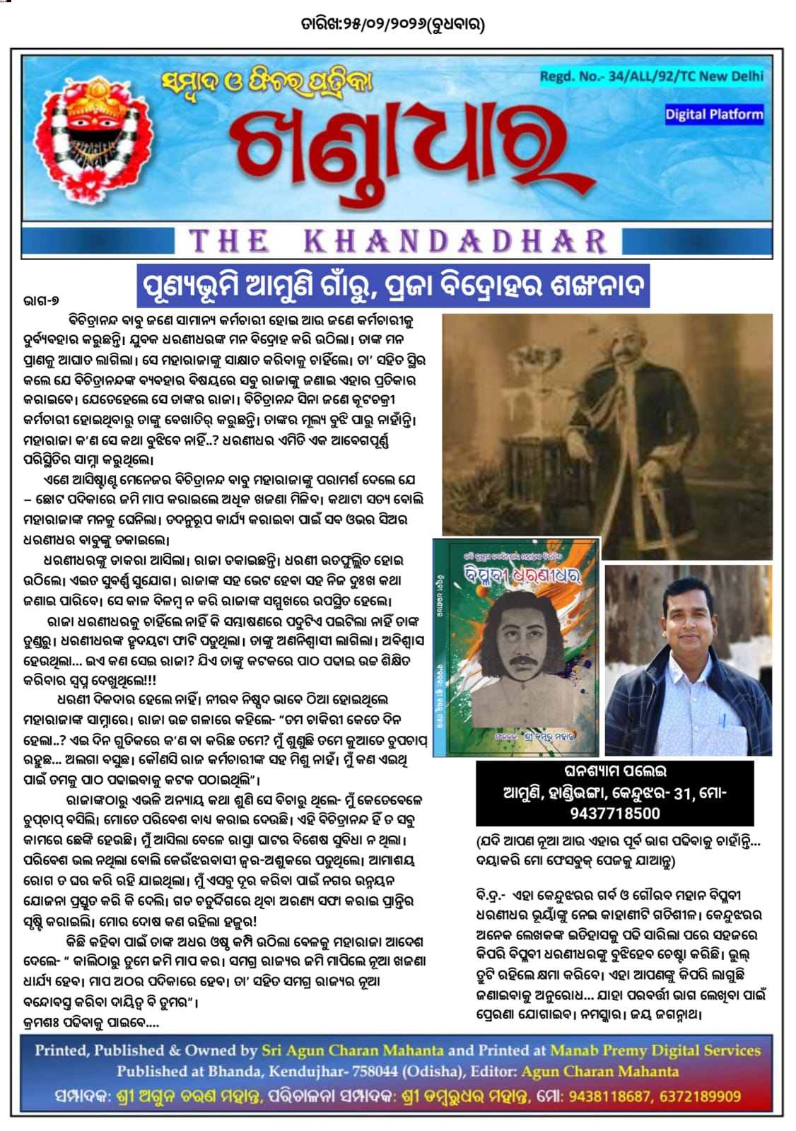 ଏହା କେନ୍ଦୁଝରର ଗର୍ବ ଓ ଗୌରବ ମହାନ ବିପ୍ଳବୀ ଧରଣୀଧର ଭୂୟାଁଙ୍କୁ ନେଇ କାହାଣୀଟି ଗତିଶୀଳ। କେନ୍ଦୁଝରର ଅନେକ ଲେଖକଙ୍କ ଇତିହାସକୁ ପଢି ସାରିଲା ପରେ ସହଜରେ କିପରି ବିପ୍ଳବୀ ଧରଣୀଧରଙ୍କୁ ବୁଝିହେବ ଚେଷ୍ଟା କରିଛି। ଭୁଲ୍ ତ୍ରୁଟି ରହିଲେ କ୍ଷମା କରିବେ। ଏହା ଆପଣଙ୍କୁ କିପରି ଲାଗୁଛି ଜଣାଇବାକୁ ଅନୁରୋଧ... ଯାହା ପରବର୍ତ୍ତୀ ଭାଗ ଲେଖିବା ପାଇଁ ପ୍ରେରଣା ଯୋଗାଇବ। ନମସ୍କାର। ଜୟ ଜଗନ୍ନାଥ।