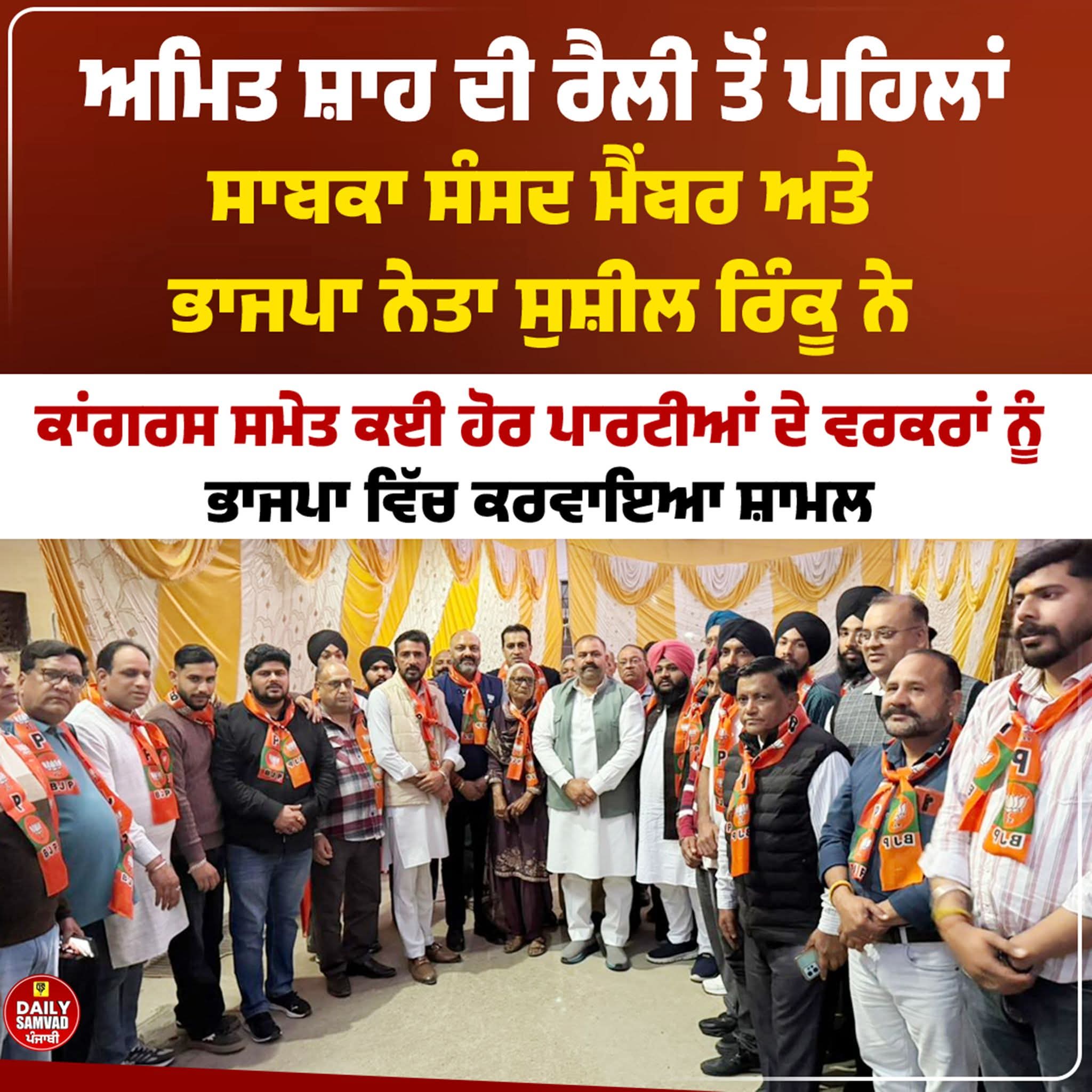 ਅਮਿਤ ਸ਼ਾਹ ਦੀ ਰੈਲੀ ਤੋਂ ਪਹਿਲਾਂ ਸਾਬਕਾ ਸੰਸਦ ਮੈਂਬਰ ਅਤੇ ਭਾਜਪਾ ਨੇਤਾ ਸੁਸ਼ੀਲ ਰਿੰਕੂ ਨੇ ਕਾਂਗਰਸ ਸਮੇਤ ਕਈ ਹੋਰ ਪਾਰਟੀਆਂ ਦੇ ਵਰਕਰਾਂ ਨੂੰ ਭਾਜਪਾ ਵਿੱਚ ਕਰਵਾਇਆ ਸ਼ਾਮਲ