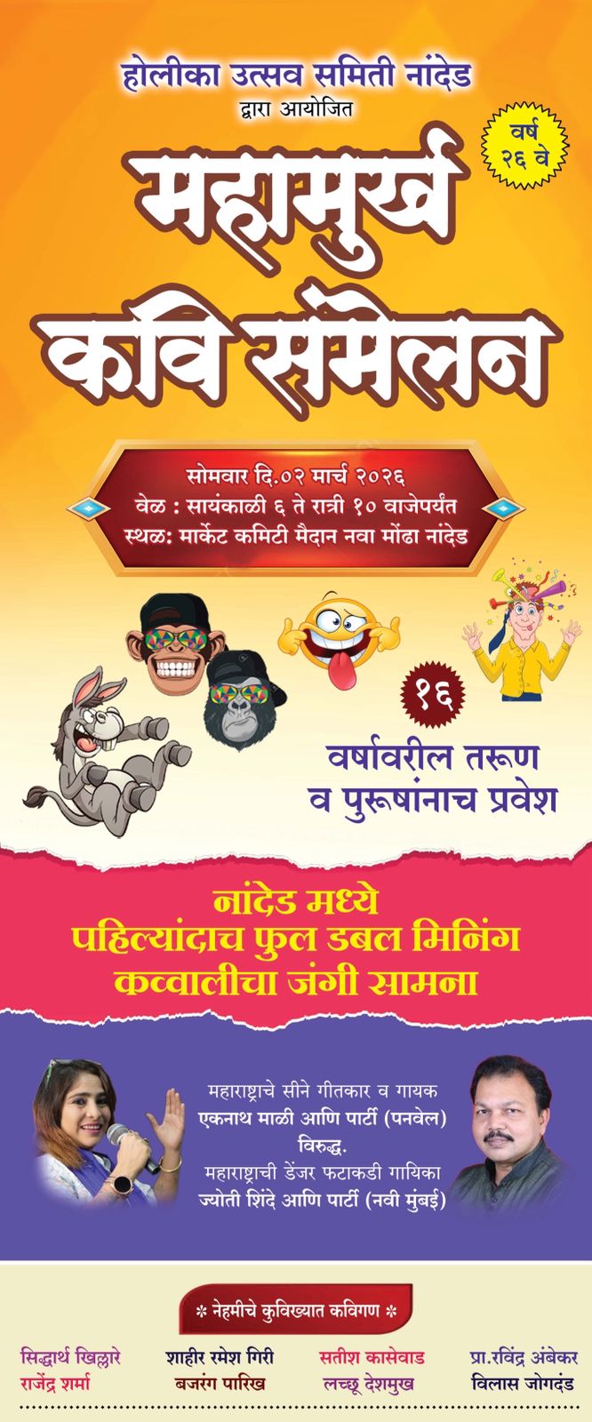 *होळी निमित्त होणाऱ्या २६ व्या महामूर्ख कवी संमेलनात यावर्षी पहिल्यांदाच द्विअर्थी कव्वालीचा कार्यक्रम ठेवण्यात आला.