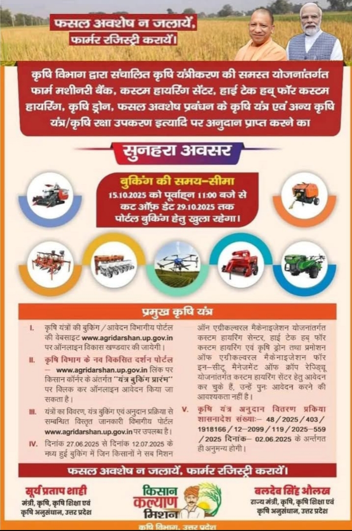 III. यंत्रों का विवरण, यंत्र बुकिंग एवं अनुदान प्रक्रिया से सम्बन्धित विस्तृत जानकारी विभागीय पोर्टल www.agridarshan.up.gov.in पर उपलब्ध है।