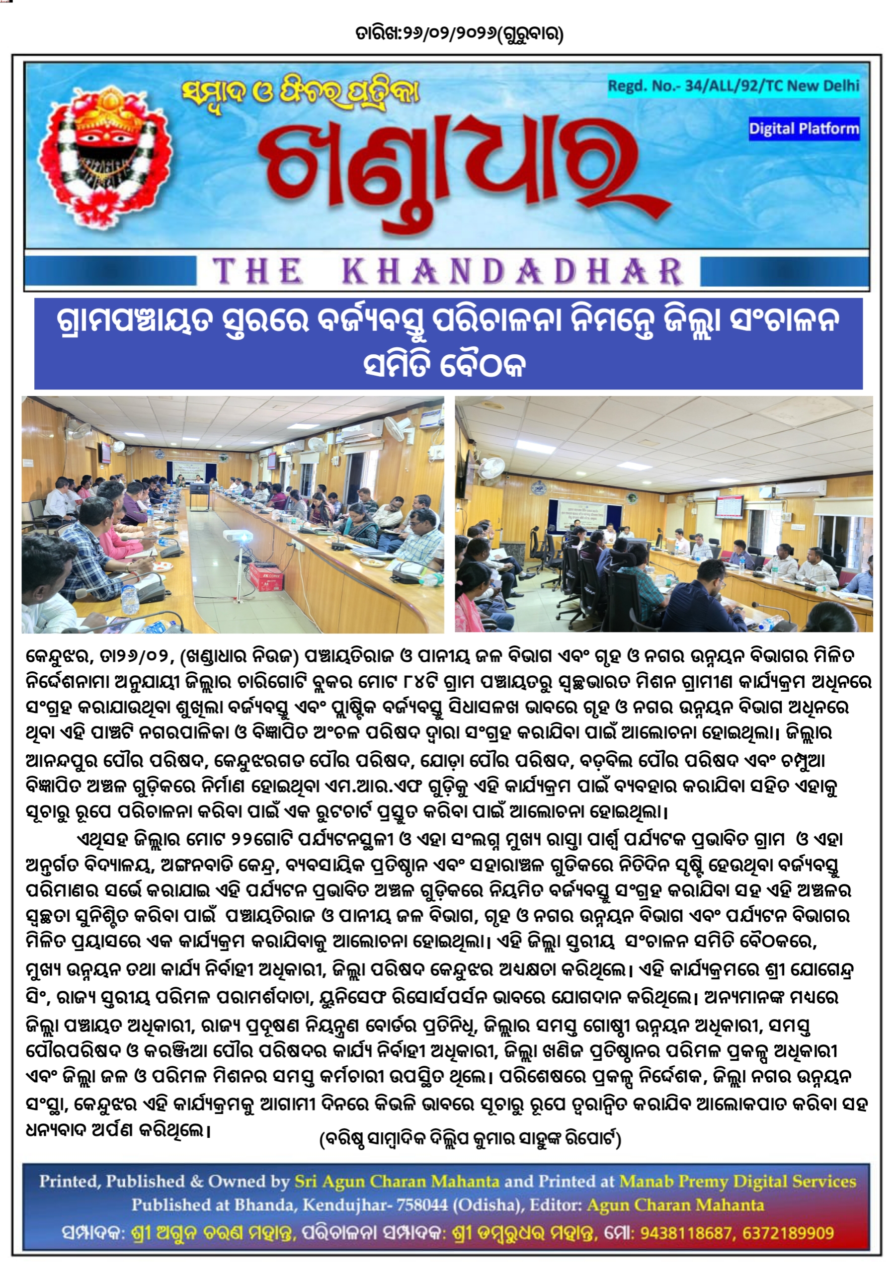 ଗ୍ରାମପଞ୍ଚାୟତ ସ୍ତରରେ ବର୍ଜ୍ୟବସ୍ତୁ ପରିଚାଳନା ନିମନ୍ତେ ଜିଲ୍ଲା ସଂଚାଳନ ସମିତି ବୈଠକ।