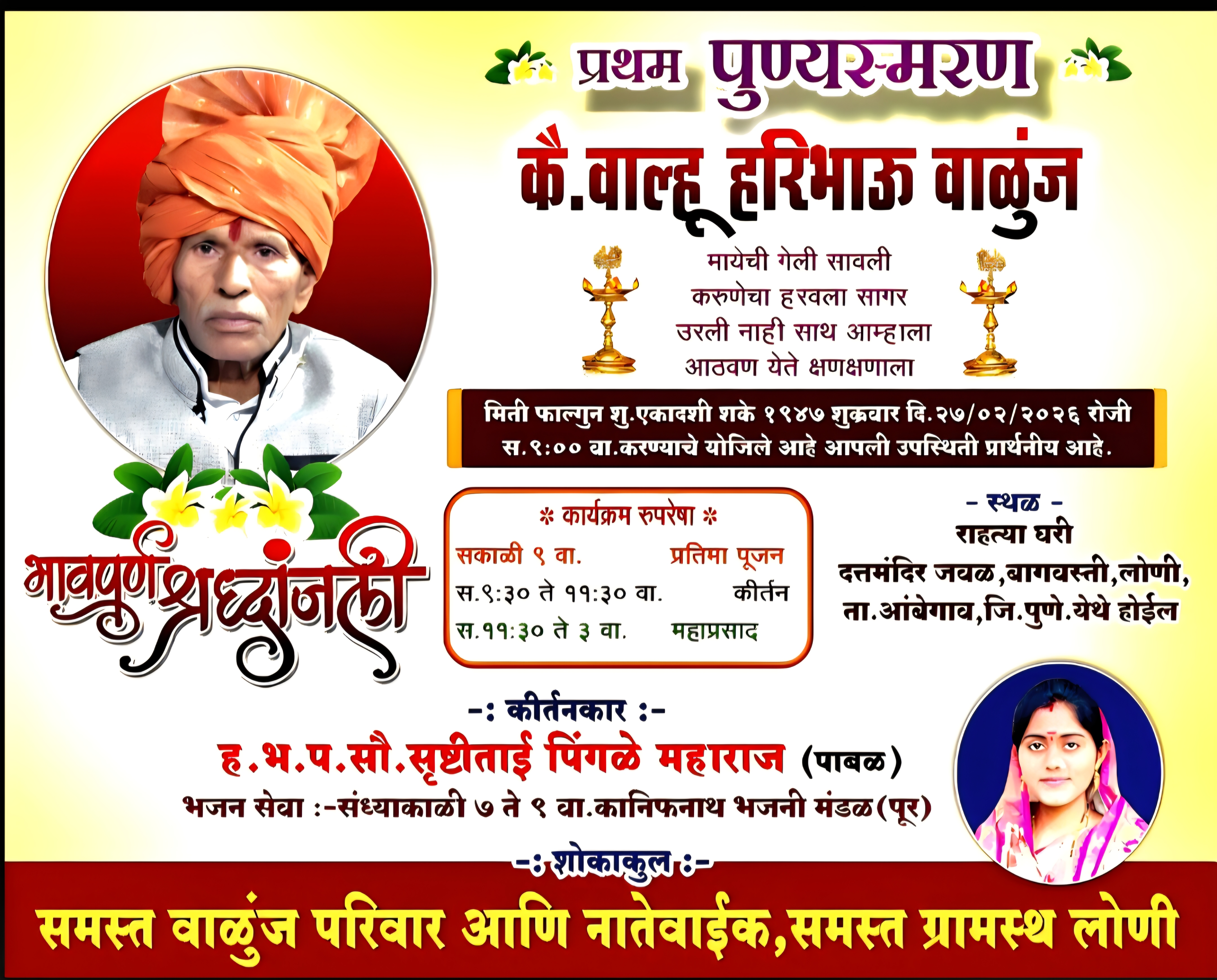 लोणी (बागवस्ती) येथे कै. वाल्हू हरिभाऊ वाळुंज पा. यांच्या प्रथम पुण्यस्मरणानिमित्त कुटुंबियांच्या वतीने शुक्रवार दि.२७/०२/२०२६ रोजी कीर्तन, भजन व महाप्रसादाचे आयोजन करण्यात आले होते. या कार्यक्रमाचे आयोजन श्री. राहुल वाल्हू वाळुंज (मुलगा, उद्योजक), सौ. सुवर्णा राहुल वाळुंज (सून), सौ. मंगल मुक्ताराम गोपाळे (मुलगी), सौ. जयश्री अशोक काळे (मुलगी), श्री. तेजस बाळासाहेब वाळुंज (नातू, पत्रकार) व सौ. सरस्वती तेजस वाळुंज (नातसून) यांनी केले होते.