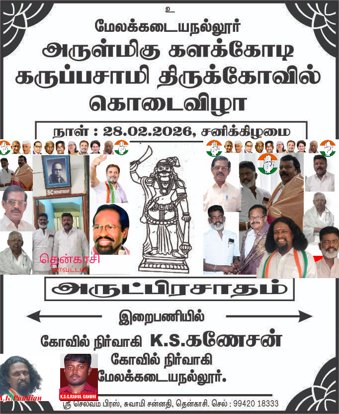 28/02/2026 இன்றும், நாளையும் தென்காசி மாவட்டம் மேல கடையநல்லூரில் அருள்மிகு களக்கோடி கருப்பசாமி திருக்கோவில் கொடை விழாவானது, கோவில் நிர்வாகி நல்லூர் நாயகன் கே.எஸ்.கணேசன் இறைப் பணியில் நடைபெற்றுக் கொண்டிருக்கிறது.