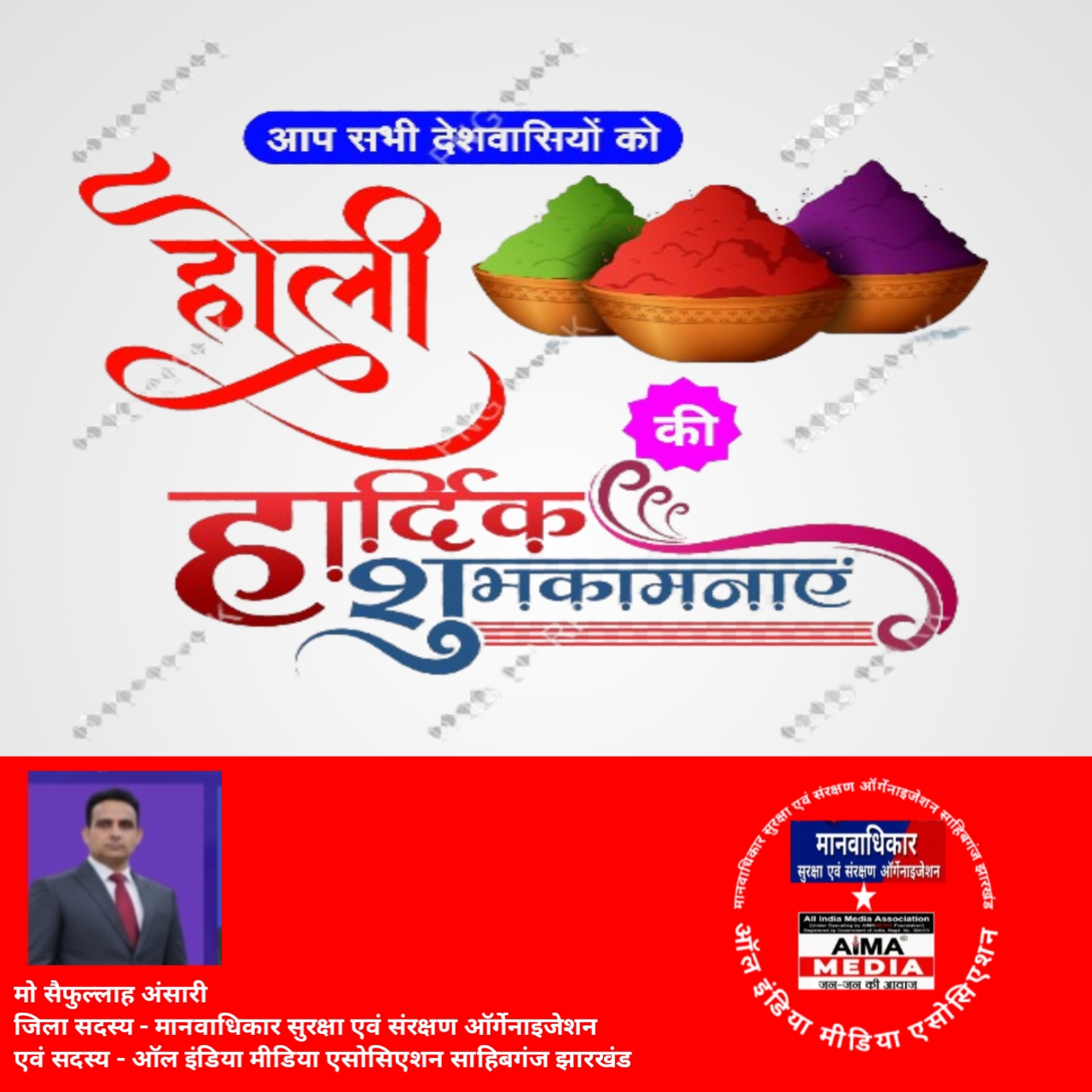 रंगों के पावन पर्व होली के अवसर पर मानव अधिकार सुरक्षा एवं संरक्षण ऑर्गेनाइजेशन के जिला सदस्य मो० सैफुल्लाह अंसारी ने जिलेवासियों को हार्दिक बधाई एवं शुभकामनाएँ दी हैं।