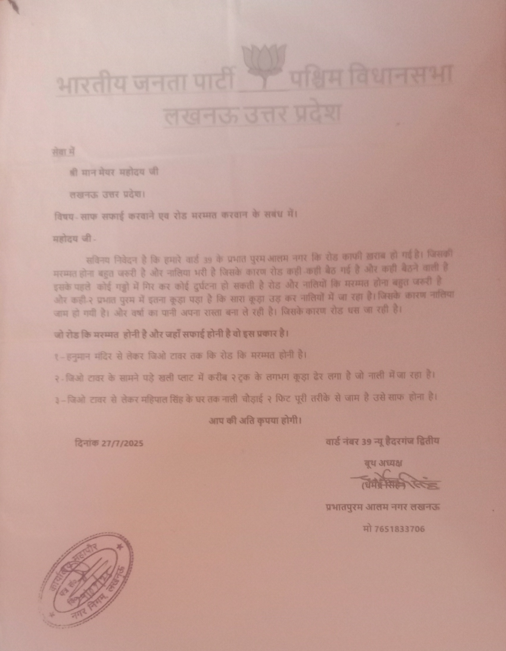प्रभातपुरम आलमनगर न्यू हैदरगंज द्वितीय जॉन 6 में जिओ टावर के पास से लेकर हनुमान मंदिर तक नाली पूरी तरीके से भरी हुई है सही नाली पति हुई है जिसकी सूचना निरंतर क्षेत्रीय सभासद नगर निगम 1533 पर और माननीय मेयर जी लखनऊ के यहां भी दिया गया लेकिन क्षेत्र कोई सुनवाई नहीं की जा रही है जिससे व्यथित होता है की जनता को अनदेखा किया जा रहा है और जनता की समस्या को नजरअंजाद किया जा रहा है । केवल बड़ी-बड़ी बात है कर कुछ भी नहीं जनता का देश को केवल गुमराह करने कार्य किया जा रहा है।