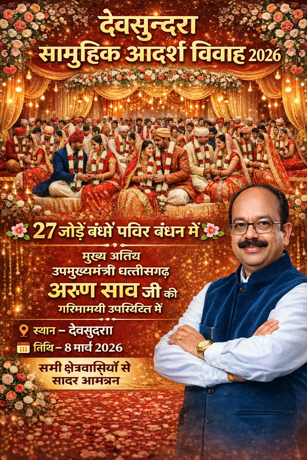 देवसुंदरा में सामूहिक विवाह: 27 जोड़े बंधेंगे परिणय सूत्र में, उप मुख्यमंत्री अरुण साव होंगे शामिल