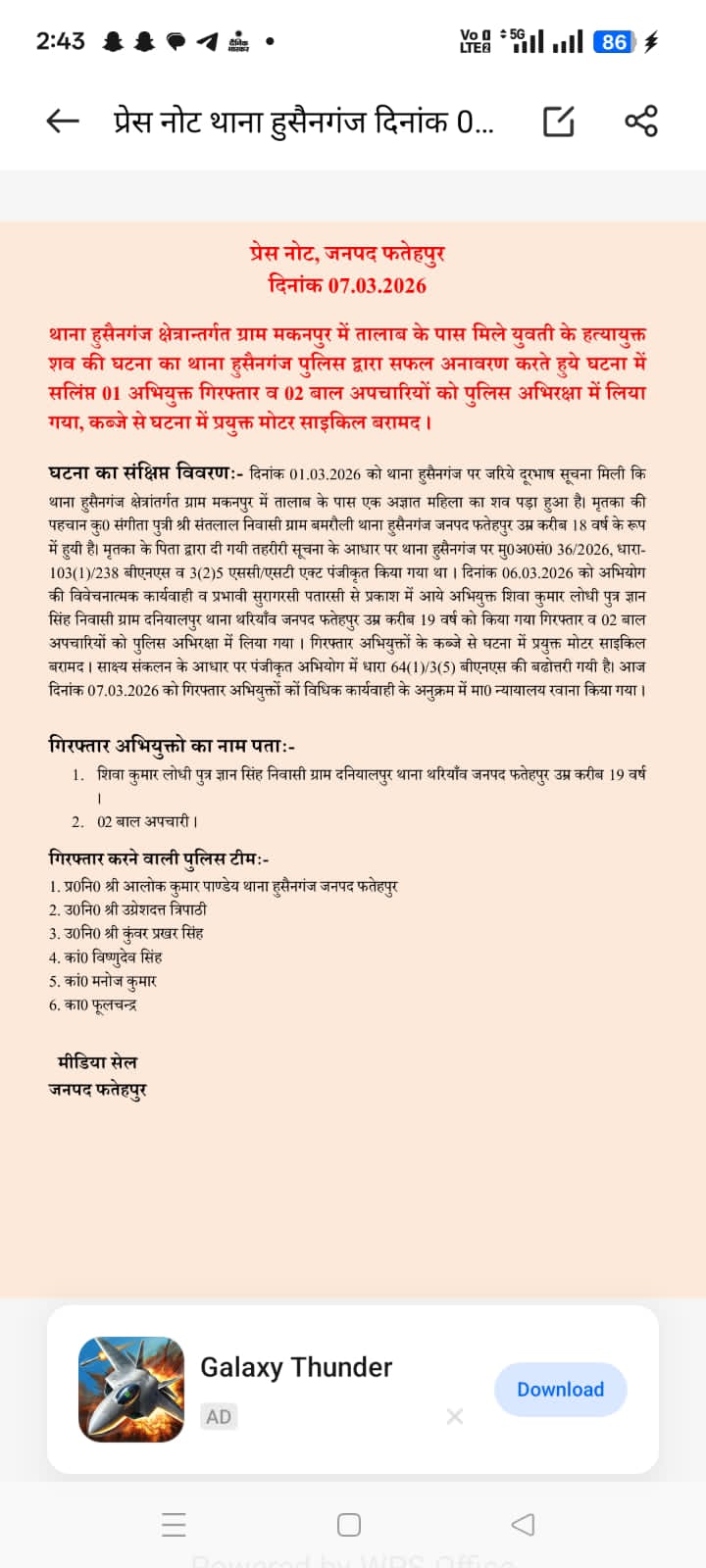 फ़तेहपुर जिले के हुसैनगंज थाना क्षेत्र के मकनपुर गांव के तालाब में हत्या युक्त मिली युवती को शिनाख्त कर हत्या का पुलिस ने खुलासा कर दिया। पकड़े गए दो नाबालिक किशोर के साथ युवक को गिरफ्तार कर हत्या का खुलासा किया। हुसेनगंज पुलिस की माने तो मृतका युवती का शिवा से प्रेम प्रसंग था। युवती शादी का दबाव बनाई तो शिवा ने गांव के दो नाबालिक बच्चो के साथ मिलकर उसकी गला घोंटकर हत्या कर शव को तालाब में फेकर फरार हो गया। हुसैनगंज पुलिस ने खुलासा कर आरोपियों को न्यायालय के समक्ष पेश किया है