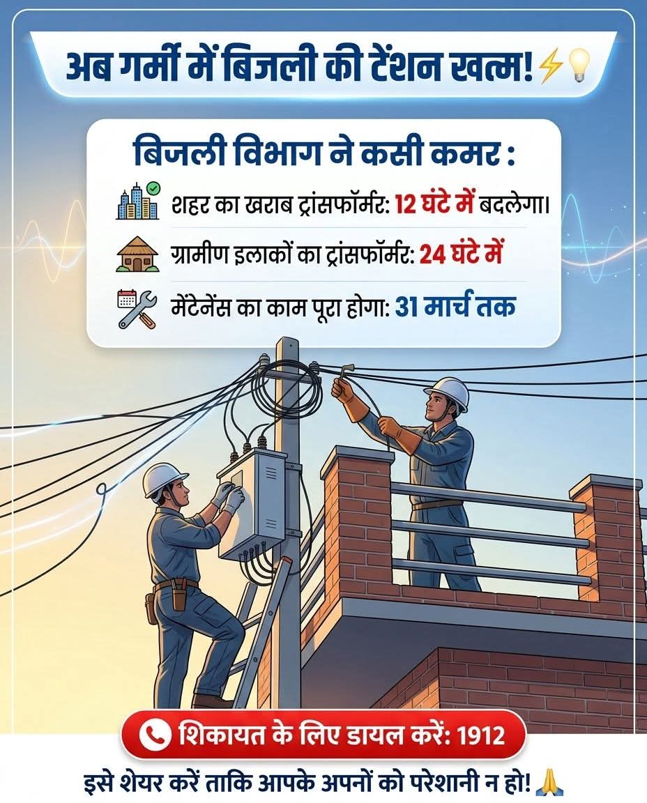 विद्युत विभाग ने आदेश दिया है कि 31 मार्च तक सभी प्रिवेंटिव मेंटेनेंस (मरम्मत) के काम पूरे कर लिए जाएं ताकि भीषण गर्मी में लाइन ट्रिपिंग की समस्या न हो। 👷‍♂️⚙️