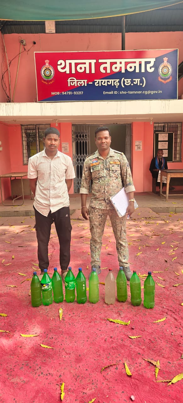 थाना तमनार पुलिस को मुखबिर से सूचना मिली कि ग्राम आमाघाट का रहने वाला निर्मल मिंज (20 वर्ष) अवैध रूप से हाथ भट्ठी से बनी महुआ शराब लेकर बिक्री के लिए जा रहा है। पुलिस टीम द्वारा