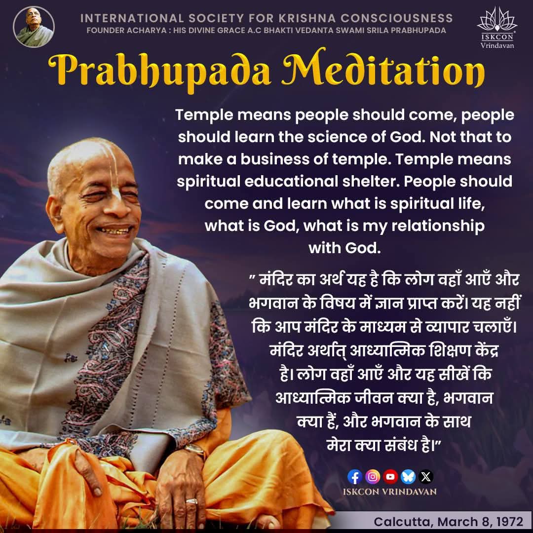 मंदिर का अर्थ है कि लोग वहाँ आयें और वे भगवान् के विषय में ज्ञान प्राप्त करें। यह नहीं कि आप मंदिर के माध्यम से व्यापार चलायें। मंदिर अर्थात् आध्यात्मिक शिक्षण केन्द्र । लोग आयें और सीखें कि आध्यात्मिक जीवन क्या है, भगवान् क्या हैं, भगवान् के साथ मेरा क्या सम्बन्ध है।