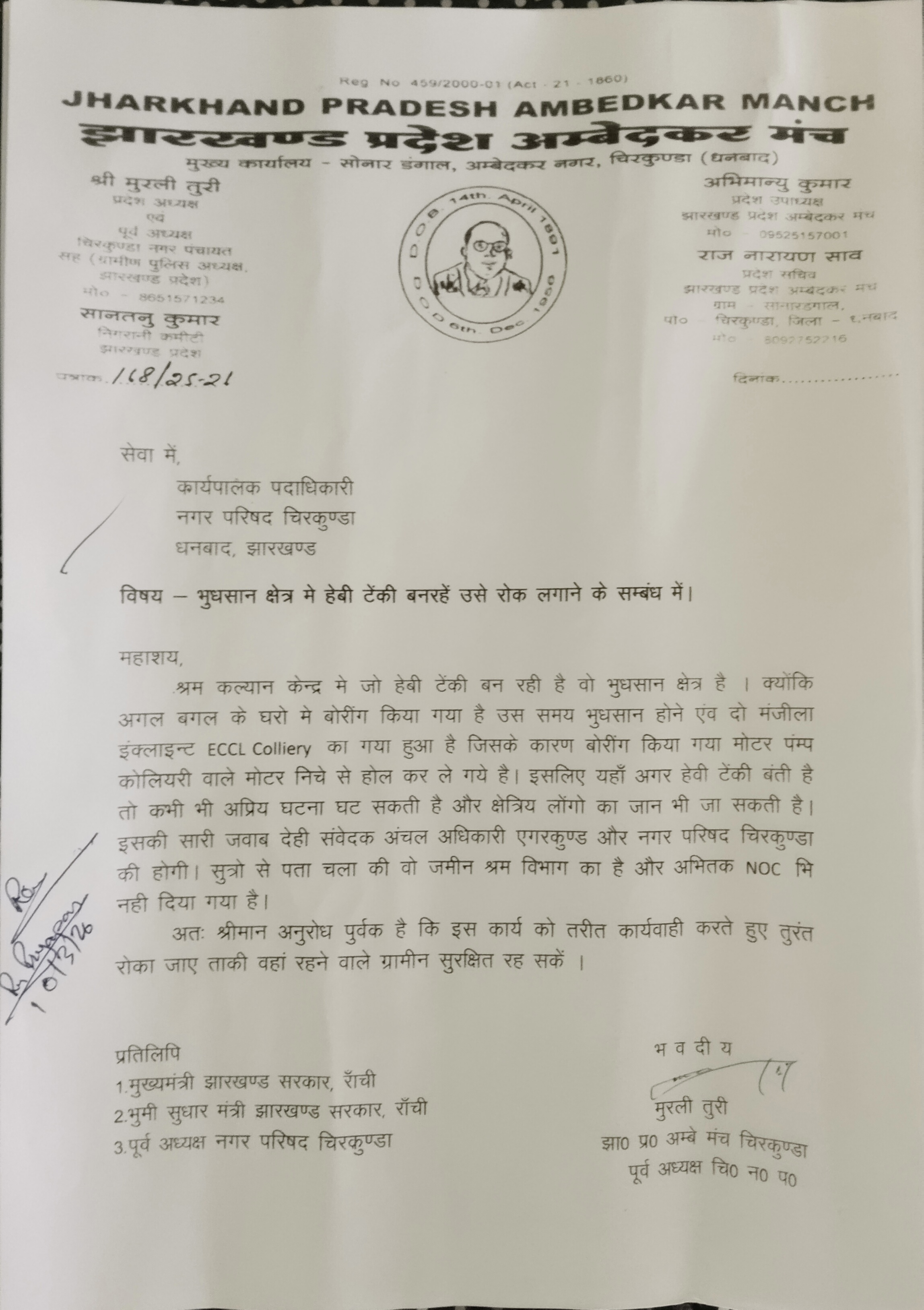 चिरकुंडा (धनबाद): विकास की दौड़ में क्या हम सुरक्षा को पीछे छोड़ रहे हैं? चिरकुंडा के श्रम कल्याण केंद्र के पास बन रही एक भारी-भरकम पानी की टंकी ने स्थानीय निवासियों और सामाजिक संगठनों की नींद उड़ा दी है। झारखण्ड प्रदेश अम्बेडकर मंच ने इस परियोजना के खिलाफ मोर्चा खोलते हुए इसे भविष्य की एक बड़ी त्रासदी का संकेत बताया है।