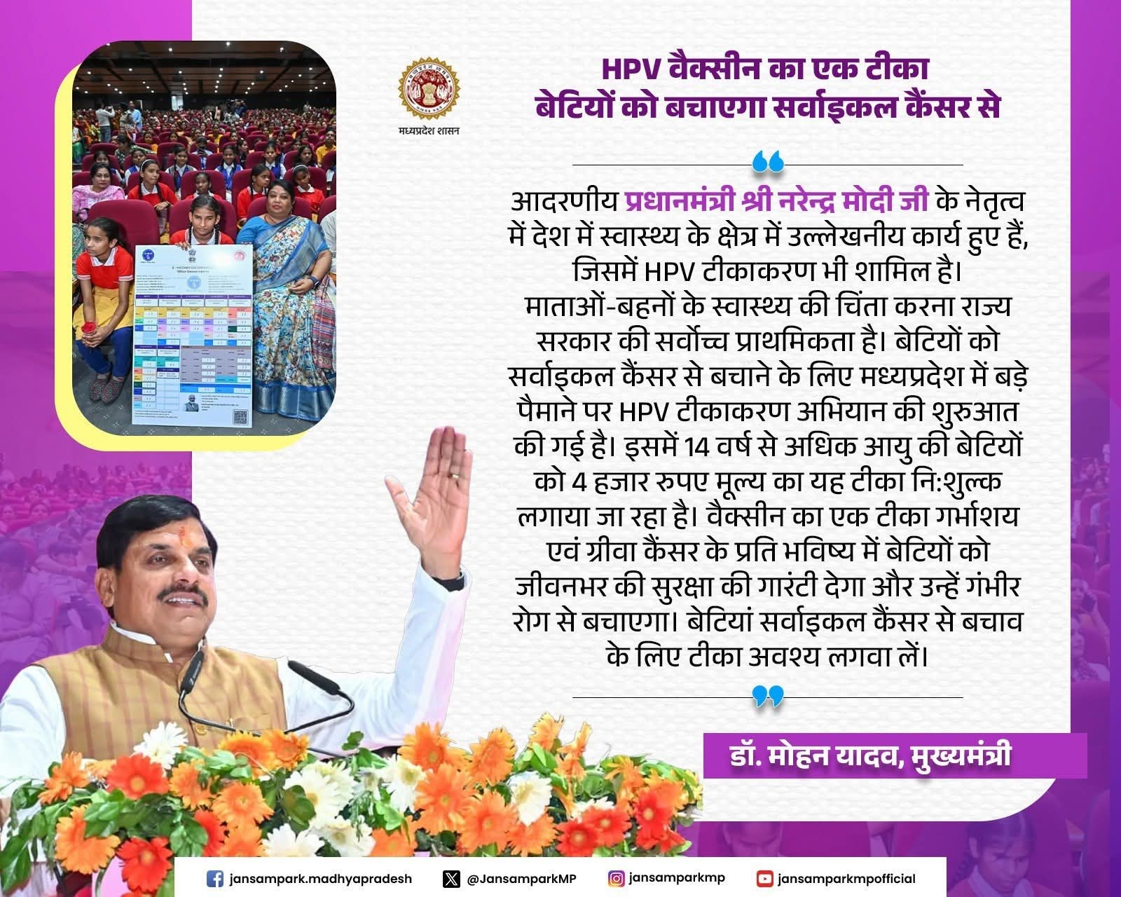 माताओं-बहनों के स्वास्थ्य की चिंता करना राज्य सरकार की सर्वोच्च प्राथमिकता है। बेटियों को सर्वाइकल कैंसर से बचाने के लिए मध्यप्रदेश में बड़े पैमाने पर HPV टीकाकरण अभियान की शुरुआत की गई है। इसमें 14 वर्ष से अधिक आयु की बेटियों को 4 हजार रुपए मूल्य का यह टीका नि:शुल्क लगाया जा रहा है। बेटियां सर्वाइकल कैंसर से बचाव के लिए टीका अवश्य लगवा लें।