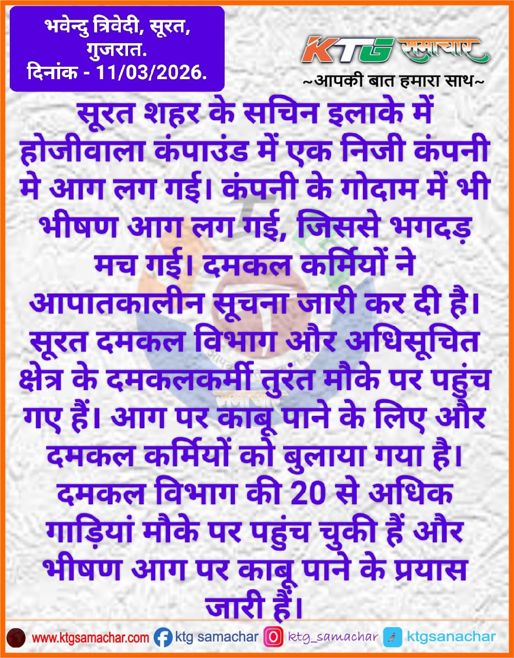 सूरत शहर के सचिन इलाके में होजीवाला कंपाउंड में एक निजी कंपनी में आग लग गई।