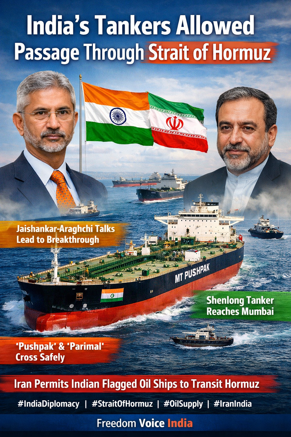 S. Jaishankar aur Abbas Araghchi ke darmiyan recent diplomatic talks ke baad Iran ne Indian-flagged oil tankers ko Strait of Hormuz cross karne ki permission di hai. Reports ke mutabiq Indian tankers “Pushpak” aur “Parimal” safely route cross kar chuke hain.