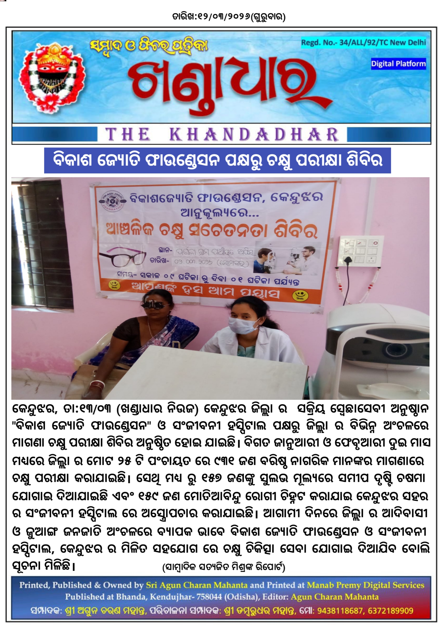 କେନ୍ଦୁଝର, ତା:୧୩/୦୩ (ଖଣ୍ଡାଧାର ନିଉଜ) କେନ୍ଦୁଝର ଜିଲ୍ଲା ର ସକ୍ରିୟ ସ୍ବେଛାସେବୀ ଅନୁଷ୍ଠାନ "ବିକାଶ ଜ୍ୟୋତି ଫାଉଣ୍ଡେସନ" ଓ ସଂଜୀବନୀ ହସ୍ପିଟାଲ ପକ୍ଷରୁ ଜିଲ୍ଲା ର ବିଭିନ୍ନ ଅଂଚଳରେ ମାଗଣା ଚକ୍ଷୁ ପରୀକ୍ଷା ଶିବିର ଅନୁଷ୍ଠିତ ହୋଇ ଯାଇଛି। ବିଗତ ଜାନୁଆରୀ ଓ ଫେବୃଆରୀ ଦୁଇ ମାସ ମଧ୍ୟରେ ଜିଲ୍ଲା ର ମୋଟ ୨୫ ଟି ପଂଚାୟତ ରେ ୯୩୧ ଜଣ ବରିଷ୍ଠ ନାଗରିକ ମାନଙ୍କର ମାଗଣାରେ ଚକ୍ଷୁ ପରୀକ୍ଷା କରାଯାଇଛି। ସେଥି ମଧ୍ୟ ରୁ ୧୫୭ ଜଣଙ୍କୁ ସୁଲଭ ମୂଲ୍ୟରେ ସମୀପ ଦୃଷ୍ଟି ଚଷମା ଯୋଗାଇ ଦିଆଯାଇଛି ଏବଂ ୧୫୯ ଜଣ ମୋତିଆବିନ୍ଦୁ ରୋଗୀ ଚିହ୍ନଟ କରାଯାଇ କେନ୍ଦୁଝର ସହର ର ସଂଜୀବନୀ ହସ୍ପିଟାଲ ରେ ଅସ୍ତ୍ରୋପଚାର କରାଯାଇଛି। ଆଗାମୀ ଦିନରେ ଜିଲ୍ଲା ର ଆଦିବାସୀ ଓ ଜୁଆଙ୍ଗ ଜନଜାତି ଅଂଚଳରେ ବ୍ୟାପକ ଭାବେ ବିକାଶ ଜ୍ୟୋତି ଫାଉଣ୍ଡେସନ ଓ ସଂଜୀବନୀ ହସ୍ପିଟାଲ, କେନ୍ଦୁଝର ର ମିଳିତ ସହଯୋଗ ରେ ଚକ୍ଷୁ ଚିକିତ୍ସା ସେବା ଯୋଗାଇ ଦିଆଯିବ ବୋଲି ସୂଚନା ମିଳିଛି।