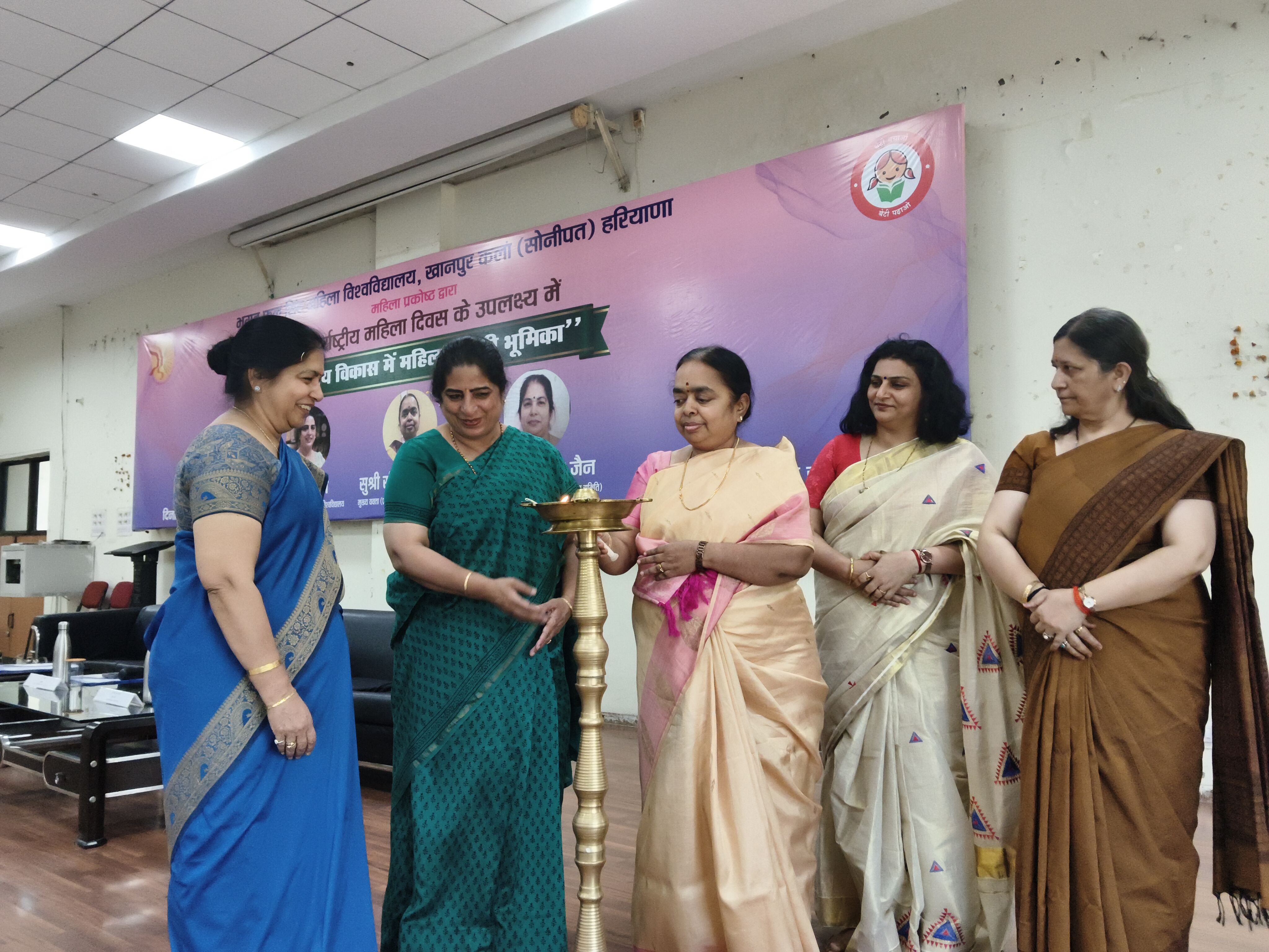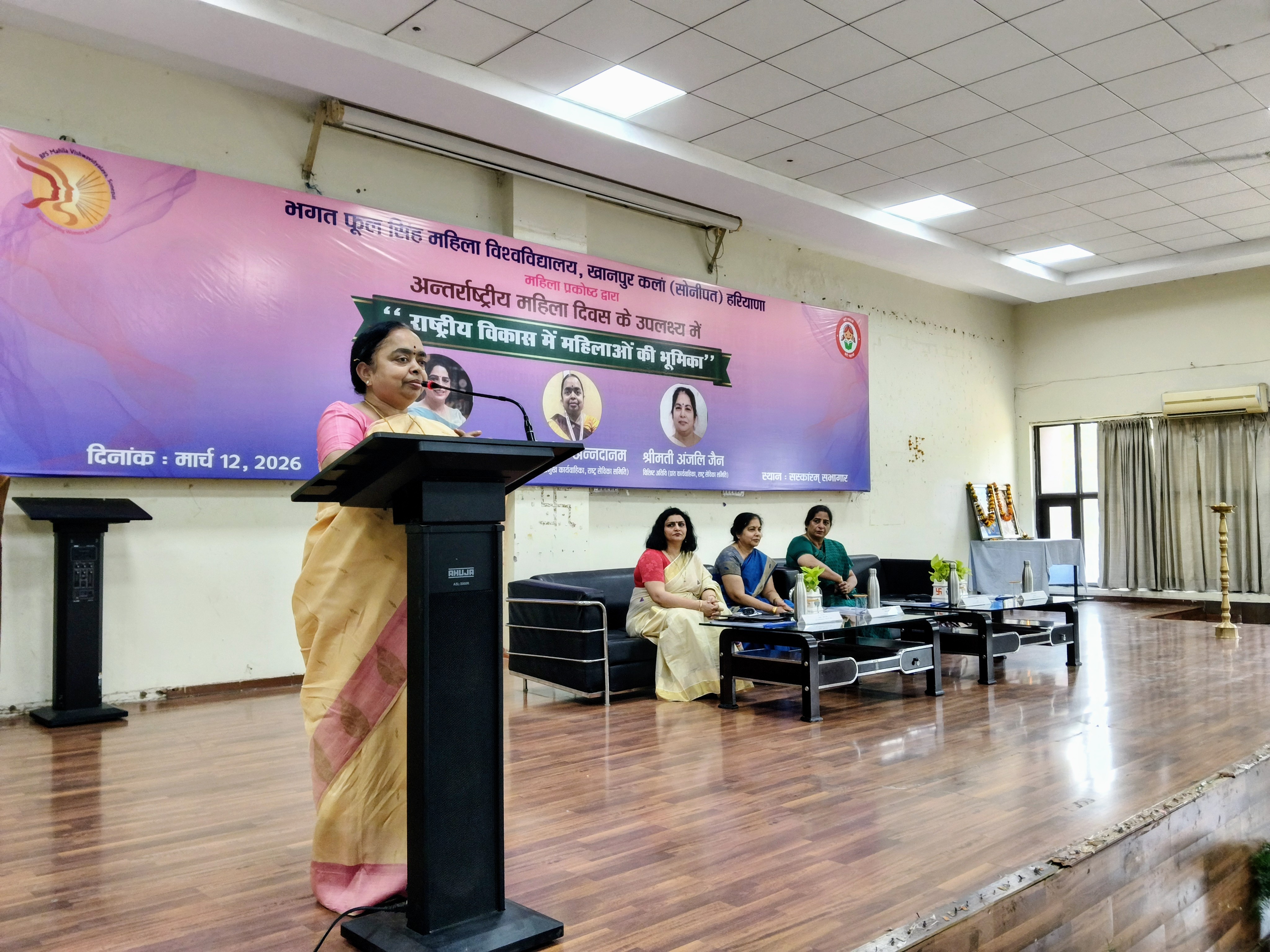 अंतर्राष्ट्रीय महिला दिवस के उपलक्ष्य में भगत फूल सिंह महिला विश्वविद्यालय , खानपुर कलां (सोनीपत) के महिला प्रकोष्ठ द्वारा “राष्ट्रीय विकास में महिलाओं की भूमिका” विषय पर एक विशेष कार्यक्रम का आयोजन किया गया। इस कार्यक्रम का उद्देश्य समाज और राष्ट्र निर्माण में महिलाओं के योगदान को रेखांकित करना तथा छात्राओं को प्रेरित करना रहा।कार्यक्रम की शुरुआत महिला प्रकोष्ठ की निदेशक प्रो मंजू पंवार द्वारा स्वागत भाषण से की गई, जिसमें उन्होंने सभी अतिथियों, शिक्षकों एवं छात्राओं का स्वागत करते हुए महिला सशक्तिकरण के महत्व पर प्रकाश डाला।इस अवसर पर राष्ट्रीय सेविका समिति हरियाणा राज्य की सह-कार्यवाहिका सुश्री अंजली जैन ने अपने प्रेरणादायी उद्बोधन में कहा कि राष्ट्र के विकास में महिलाओं की भागीदारी अत्यंत आवश्यक है। उन्होंने छात्राओं को शिक्षा, संस्कार और आत्मविश्वास के माध्यम से समाज में सकारात्मक परिवर्तन लाने के लिए प्रेरित किया। अंजलि जैन ने कहा कि महिलाओं का कोई एक विशेष दिन नहीं बल्कि हर दिन विशेष होता है। कार्यक्रम की मुख्य वक्ता के रूप में पहुंचे राष्ट्रीय सेविका समिति नागपुर (महाराष्ट्र) की महासचिव सुश्री सीतानंदम,ने अपने संबोधन में कहा कि महिलाओं की शक्ति, प्रतिभा और नेतृत्व क्षमता देश के विकास की मजबूत आधारशिला है। उन्होंने कहा कि आज की युवा पीढ़ी को समाज और राष्ट्र के प्रति अपनी जिम्मेदारियों को समझते हुए आगे बढ़ना चाहिए। महिलाओं में बहुत आत्मबल है। उन्होंने कहा कि हम समाज , धर्म और देश के ऋणी है। समाज व देश के प्रति अपना ऋण जरूर उतारें। महिलाओं का इतना आत्मसम्मान और गौरव केवल भारत में ही है। कार्यक्रम में बतौर मुख्य अतिथि मौजूद विश्वविद्यालय की कुलपति प्रो सुदेश ने अपने उद्बोधन में कहा कि महिलाएं आज हर क्षेत्र में अपनी प्रतिभा का लोहा मनवा रही हैं और राष्ट्र निर्माण में महत्वपूर्ण भूमिका निभा रही हैं।कुलपति ने कहा कि महिलाओं में धैर्य की कमी नहीं होती।  उन्होंने छात्राओं को आत्मनिर्भर बनने और समाज के विकास में सक्रिय भागीदारी निभाने के लिए प्रेरित किया।कार्यक्रम में मंच संचालन प्रो रीना ने किया जबकि धन्यवाद ज्ञापन डॉ वीणा शर्मा ने किया। फोटो कैप्शन :-01 दीप प्रज्वलन कर कार्यक्रम का शुभारम्भ करते राष्ट्रीय सेविका समिति नागपुर (महाराष्ट्र) की महासचिव सुश्री सीतानंदम व कुलपति प्रो सुदेश। 02 कार्यक्रम में सम्बोधन देते राष्ट्रीय सेविका समिति नागपुर (महाराष्ट्र) की महासचिव सुश्री सीतानंदम।