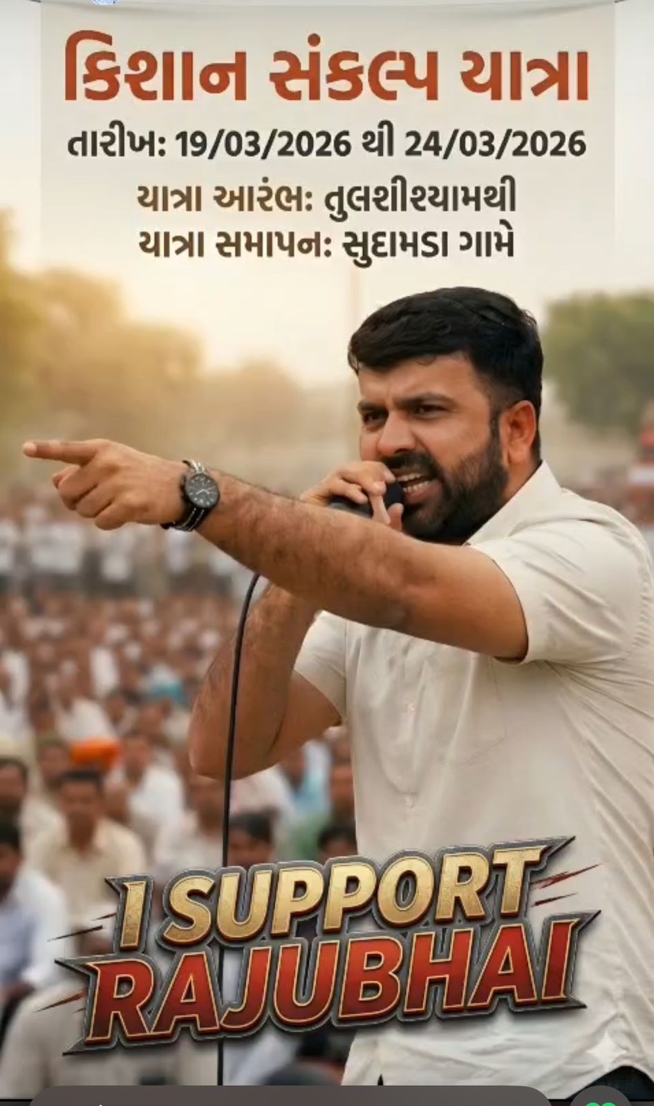 કિશાન સંકલ્પ યાત્રા તમારી: 19/03/2026 થી 24/03/2026 યાત્રા આરંભઃ તુલશીશ્યામથી યાત્રા સમાપન: સુદામડા ગામે
