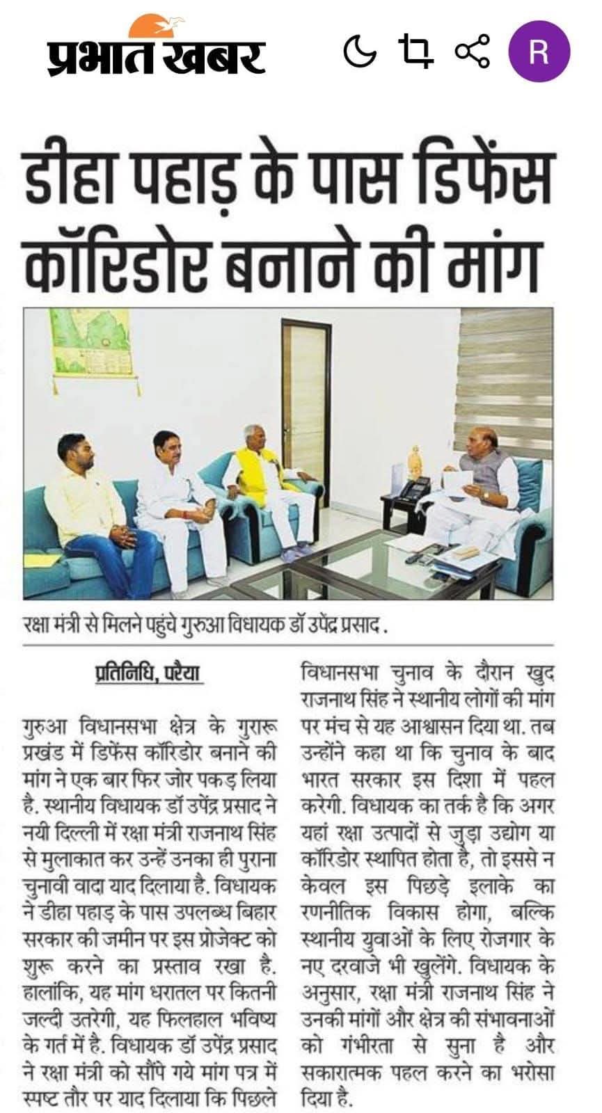 रक्षा मंत्री से मिले गुरुआ विधायक डॉ. उपेन्द्र प्रसाद