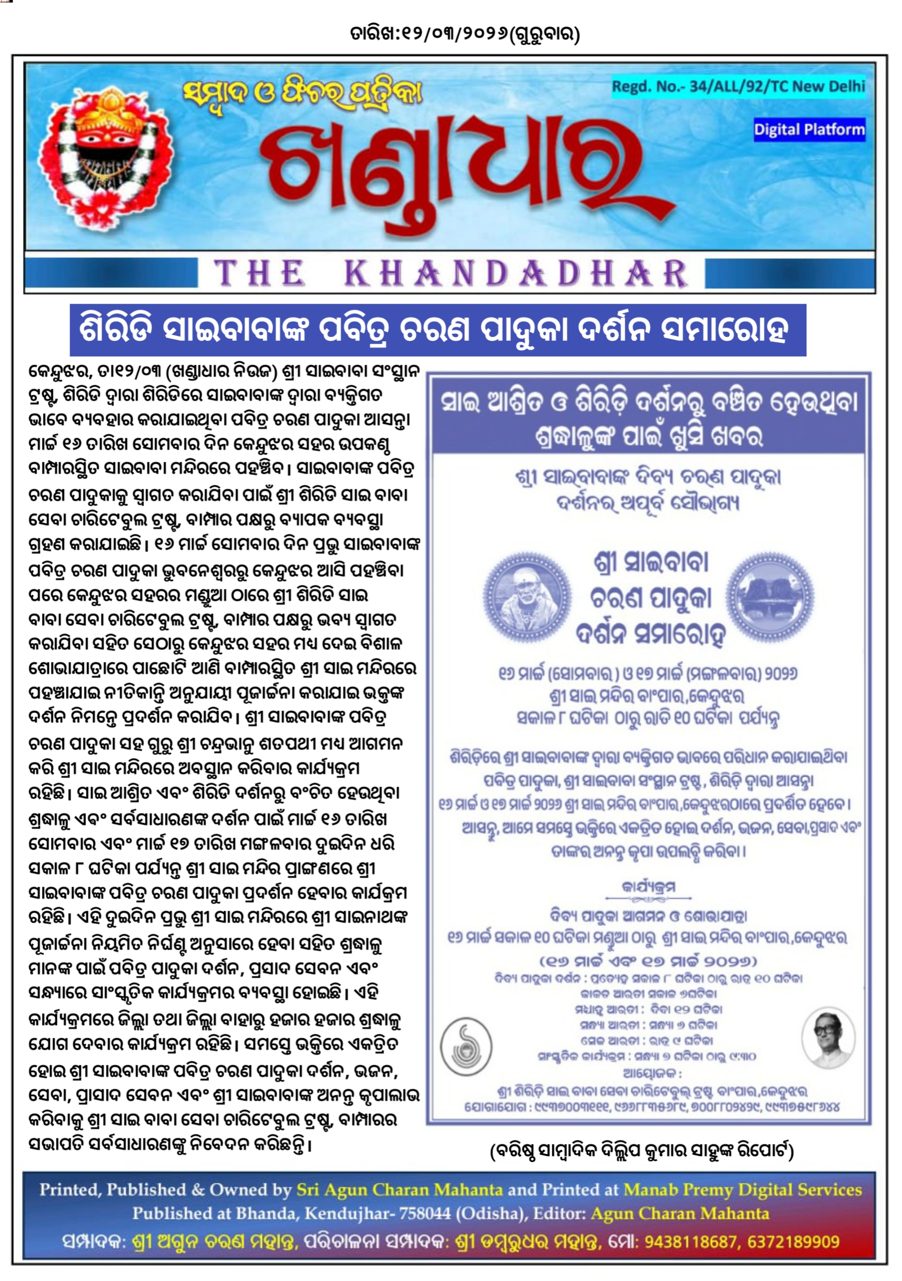 ଶିରିଡି ସାଇବାବାଙ୍କ ପବିତ୍ର ଚରଣ ପାଦୁକା ଦର୍ଶନ ସମାରୋହ।