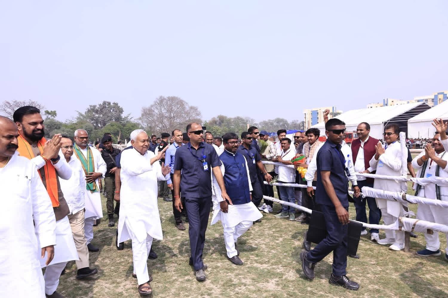 संसारपुर मैदान स्थित हेलिपैड पर हैलिकॉप्टर से जैसे ही मुख्यमंत्री नीतीश कुमार अपने मंत्रिमंडल के उपमुख्यमंत्री सम्राट चौधरी, जल संसाधन मंत्री विजय कुमार चौधरी, समाज कल्याण मंत्री सह जिला प्रभारी मंत्री मदन सहनी तथा जदयू के प्रदेश कोषाध्यक्ष सह विधान पार्षद ललन सर्राफ के साथ जब आगमन हुआ, उसी क्षण एनडीए के अनेक पदाधिकारी और कार्यकर्ता गगनभेदी नारों के साथ उनका अभिनंदन करने लगे। सभी कार्यकर्ता ने हाथ जोड़कर उनका अभिनंदन किया और उनका स्नेहिल आशीर्वाद प्राप्त कर गौरवान्वित और प्रफुल्लित हो उठे।