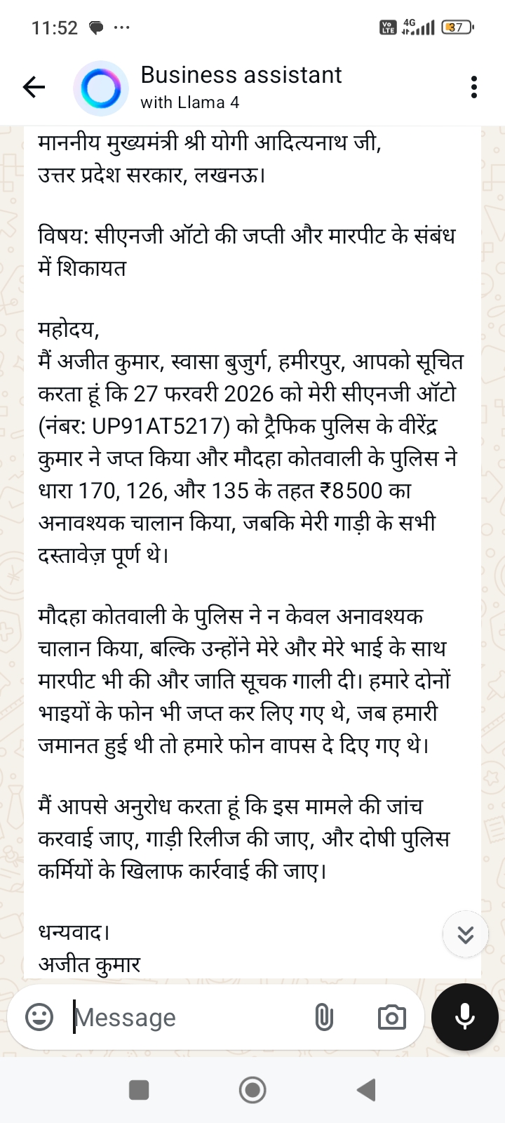 मैं अजीत कुमार, स्वासा बुजुर्ग, हमीरपुर, आपको सूचित करता हूं कि 27 फरवरी 2026 को मेरी सीएनजी ऑटो (नंबर: UP91AT5217) को ट्रैफिक पुलिस के वीरेंद्र कुमार ने जप्त किया और मौदहा कोतवाली के पुलिस ने धारा 170, 126, और 135 के तहत ₹8500 का अनावश्यक चालान किया, जबकि मेरी गाड़ी के सभी दस्तावेज़ पूर्ण थे।