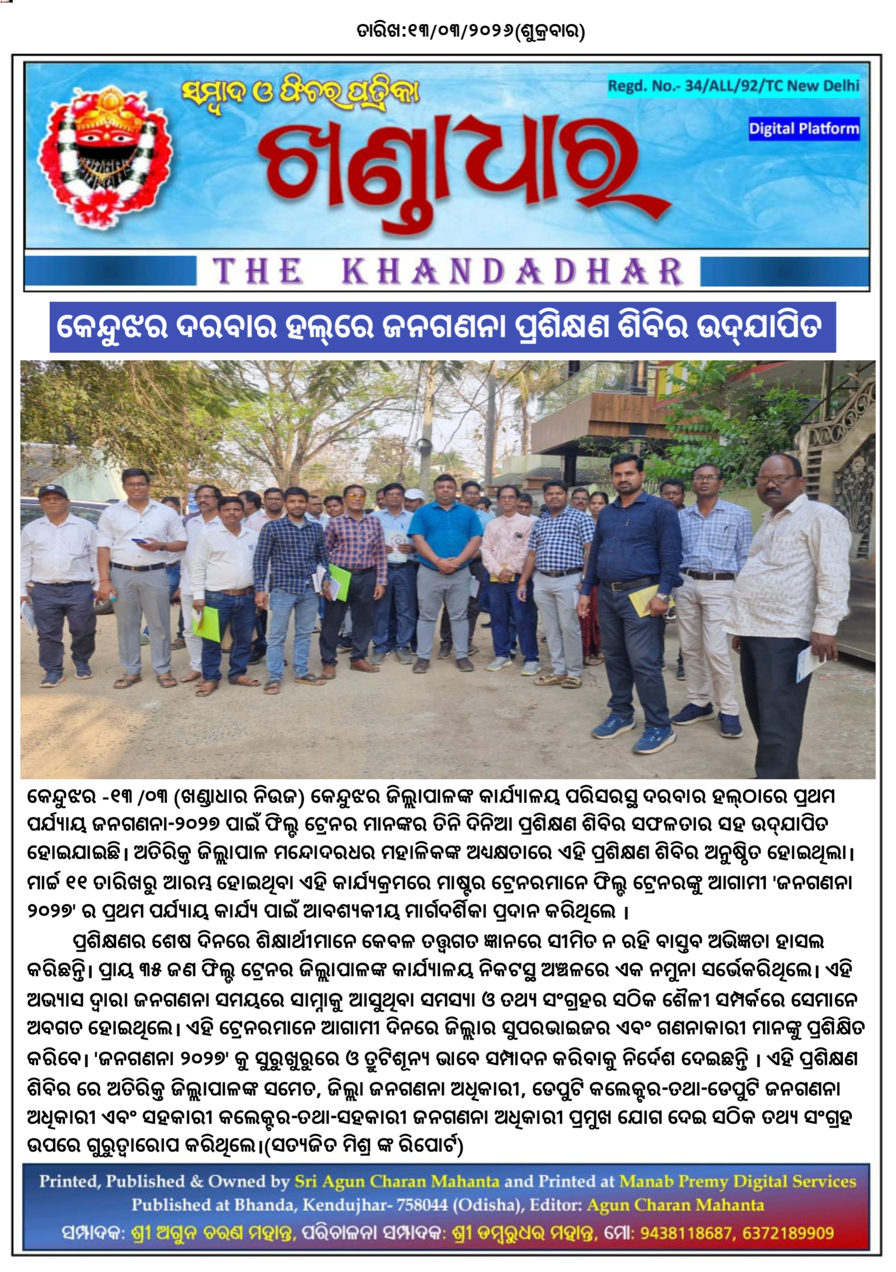 କେନ୍ଦୁଝର -୧୩ /୦୩(ଖଣ୍ଡାଧାର ନିଉଜ) କେନ୍ଦୁଝର ଜିଲ୍ଲାପାଳଙ୍କ କାର୍ଯ୍ୟାଳୟ ପରିସରସ୍ଥ ଦରବାର ହଲ୍‌ଠାରେ ପ୍ରଥମ ପର୍ଯ୍ୟାୟ ଜନଗଣନା-୨୦୨୭ ପାଇଁ ଫିଲ୍ଡ ଟ୍ରେନର ମାନଙ୍କର ତିନି ଦିନିଆ ପ୍ରଶିକ୍ଷଣ ଶିବିର ସଫଳତାର ସହ ଉଦ୍‌ଯାପିତ ହୋଇଯାଇଛି। ଅତିରିକ୍ତ ଜିଲ୍ଲାପାଳ ମନ୍ଦୋଦରଧର ମହାଳିକଙ୍କ ଅଧ୍ୟକ୍ଷତାରେ ଏହି ପ୍ରଶିକ୍ଷଣ ଶିବିର ଅନୁଷ୍ଠିତ ହୋଇଥିଲା।​ ମାର୍ଚ୍ଚ ୧୧ ତାରିଖରୁ ଆରମ୍ଭ ହୋଇଥିବା ଏହି କାର୍ଯ୍ୟକ୍ରମରେ ମାଷ୍ଟର ଟ୍ରେନରମାନେ ଫିଲ୍ଡ ଟ୍ରେନରଙ୍କୁ ଆଗାମୀ 'ଜନଗଣନା ୨୦୨୭' ର ପ୍ରଥମ ପର୍ଯ୍ୟାୟ କାର୍ଯ୍ୟ ପାଇଁ ଆବଶ୍ୟକୀୟ ମାର୍ଗଦର୍ଶିକା ପ୍ରଦାନ କରିଥିଲେ ।