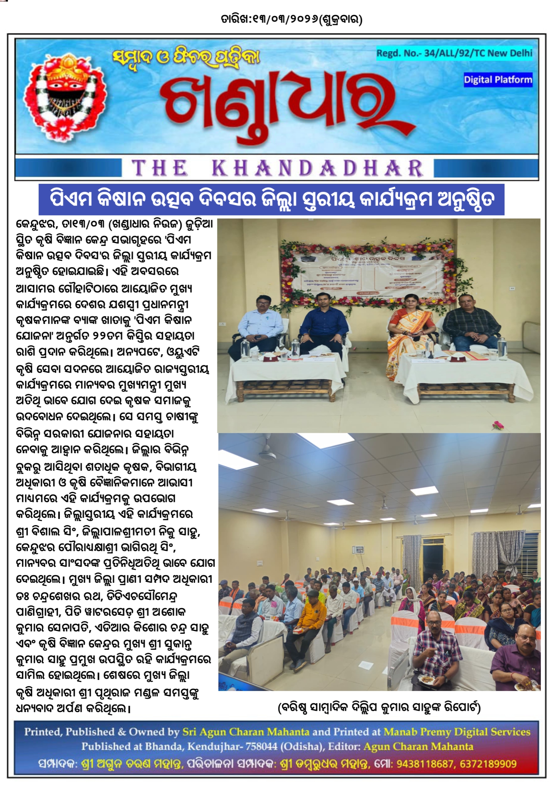 କେନ୍ଦୁଝର, ତା୧୩/୩- ଜୁଡ଼ିଆ ସ୍ଥିତ କୃଷି ବିଜ୍ଞାନ କେନ୍ଦ୍ର ସଭାଗୃହରେ 'ପିଏମ କିଷାନ ଉତ୍ସବ ଦିବସ'ର ଜିଲ୍ଲା ସ୍ତରୀୟ କାର୍ଯ୍ୟକ୍ରମ ଅନୁଷ୍ଠିତ ହୋଇଯାଇଛି। ଏହି ଅବସରରେ ଆସାମର ଗୌହାଟିଠାରେ ଆୟୋଜିତ ମୁଖ୍ୟ କାର୍ଯ୍ୟକ୍ରମରେ ଦେଶର ଯଶସ୍ବୀ ପ୍ରଧାନମନ୍ତ୍ରୀ କୃଷକମାନଙ୍କ ବ୍ୟାଙ୍କ ଖାତାକୁ 'ପିଏମ କିଷାନ ଯୋଜନା' ଅନ୍ତର୍ଗତ ୨୨ତମ କିସ୍ତିର ସହାୟତା ରାଶି ପ୍ରଦାନ କରିଥିଲେ। ଅନ୍ୟପଟେ, ଓୟୁଏଟି କୃଷି ସେବା ସଦନରେ ଆୟୋଜିତ ରାଜ୍ୟସ୍ତରୀୟ କାର୍ଯ୍ୟକ୍ରମରେ ମାନ୍ୟବର ମୁଖ୍ୟମନ୍ତ୍ରୀ ମୁଖ୍ୟ ଅତିଥି ଭାବେ ଯୋଗ ଦେଇ କୃଷକ ସମାଜକୁ ଉଦବୋଧନ ଦେଇଥିଲେ। ସେ ସମସ୍ତ ଚାଷୀଙ୍କୁ ବିଭିନ୍ନ ସରକାରୀ ଯୋଜନାର ସହାୟତା ନେବାକୁ ଆହ୍ୱାନ କରିଥିଲେ। ଜିଲ୍ଲାର ବିଭିନ୍ନ ବ୍ଲକରୁ ଆସିଥିବା ଶତାଧିକ କୃଷକ, ବିଭାଗୀୟ ଅଧିକାରୀ ଓ କୃଷି ବୈଜ୍ଞାନିକମାନେ ଆଭାସୀ ମାଧ୍ୟମରେ ଏହି କାର୍ଯ୍ୟକ୍ରମକୁ ଉପଭୋଗ କରିଥିଲେ। ଜିଲ୍ଲାସ୍ତରୀୟ ଏହି କାର୍ଯ୍ୟକ୍ରମରେ ଶ୍ରୀ ବିଶାଲ ସିଂ, ଜିଲ୍ଲାପାଳଶ୍ରୀମତୀ ନିକୁ ସାହୁ, କେନ୍ଦୁଝର ପୌରାଧ୍ୟକ୍ଷାଶ୍ରୀ ଭାଗିରଥି ସିଂ, ମାନ୍ୟବର ସାଂସଦଙ୍କ ପ୍ରତିନିଧିଅତିଥି ଭାବେ ଯୋଗ ଦେଇଥିଲେ। ମୁଖ୍ୟ ଜିଲ୍ଲା ପ୍ରାଣୀ ସମ୍ପଦ ଅଧିକାରୀ ଡଃ ଚନ୍ଦ୍ରଶେଖର ରଥ, ଡିଡିଏଚସୌମେନ୍ଦ୍ର ପାଣିଗ୍ରାହୀ, ପିଡି ୱାଟରସେଡ଼ ଶ୍ରୀ ଅଶୋକ କୁମାର ସେନାପତି, ଏଡିଆର କିଶୋର ଚନ୍ଦ୍ର ସାହୁ ଏବଂ କୃଷି ବିଜ୍ଞାନ କେନ୍ଦ୍ରର ମୁଖ୍ୟ ଶ୍ରୀ ସୁକାନ୍ତ କୁମାର ସାହୁ ପ୍ରମୁଖ ଉପସ୍ଥିତ ରହି କାର୍ଯ୍ୟକ୍ରମରେ ସାମିଲ ହୋଇଥିଲେ। ଶେଷରେ ମୁଖ୍ୟ ଜିଲ୍ଲା କୃଷି ଅଧିକାରୀ ଶ୍ରୀ ପୃଥିରାଜ ମଣ୍ଡଳ ସମସ୍ତଙ୍କୁ ଧନ୍ୟବାଦ ଅର୍ପଣ କରିଥିଲେ।