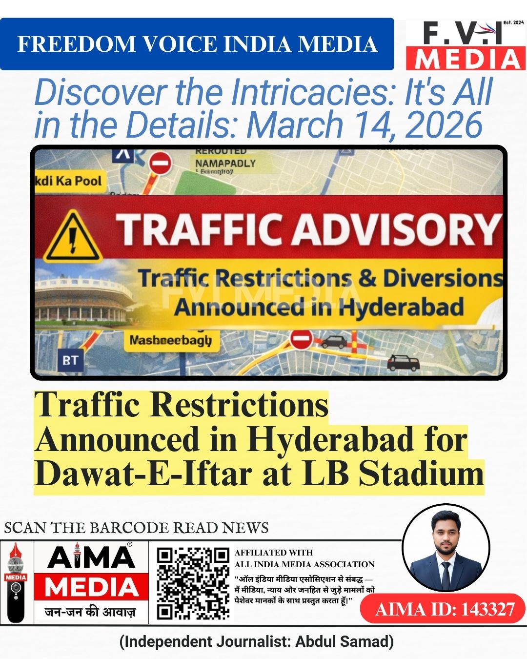 Hyderabad Traffic Police ne announce kiya hai ki 15 March 2026 ko LB Stadium mein hone wale Dawat-E-Iftar programme ke chalte shaam 5:00 PM se 10:00 PM ke beech traffic ko kai routes par divert ya temporarily stop kiya ja sakta hai.