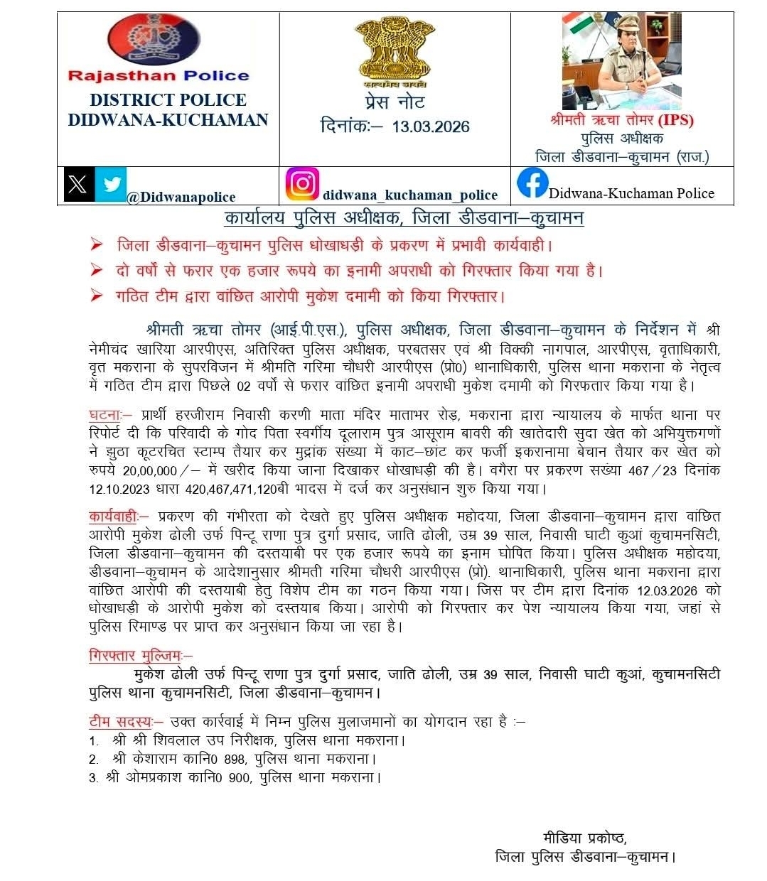 *श्रीमती ऋचा तोमर (IPS), पुलिस अधीक्षक, जिला डीडवाना–कुचामन के निर्देशन में* धोखाधड़ी के प्रकरण में प्रभावी कार्रवाई।