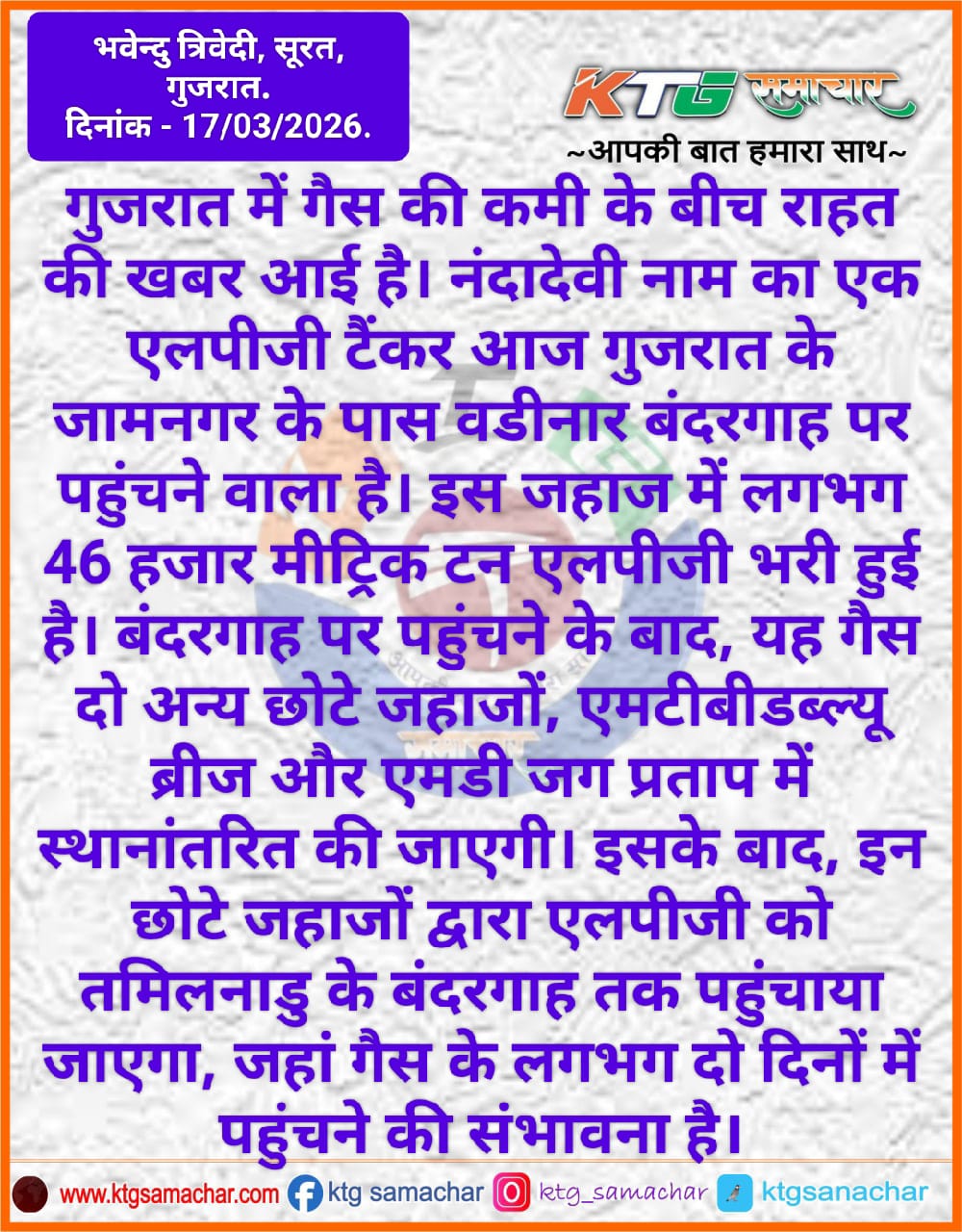नंदादेवी नाम का एक एलपीजी टैंकर आज गुजरात के जामनगर के पास बंदरगाह पर पहुंचने वाला है।