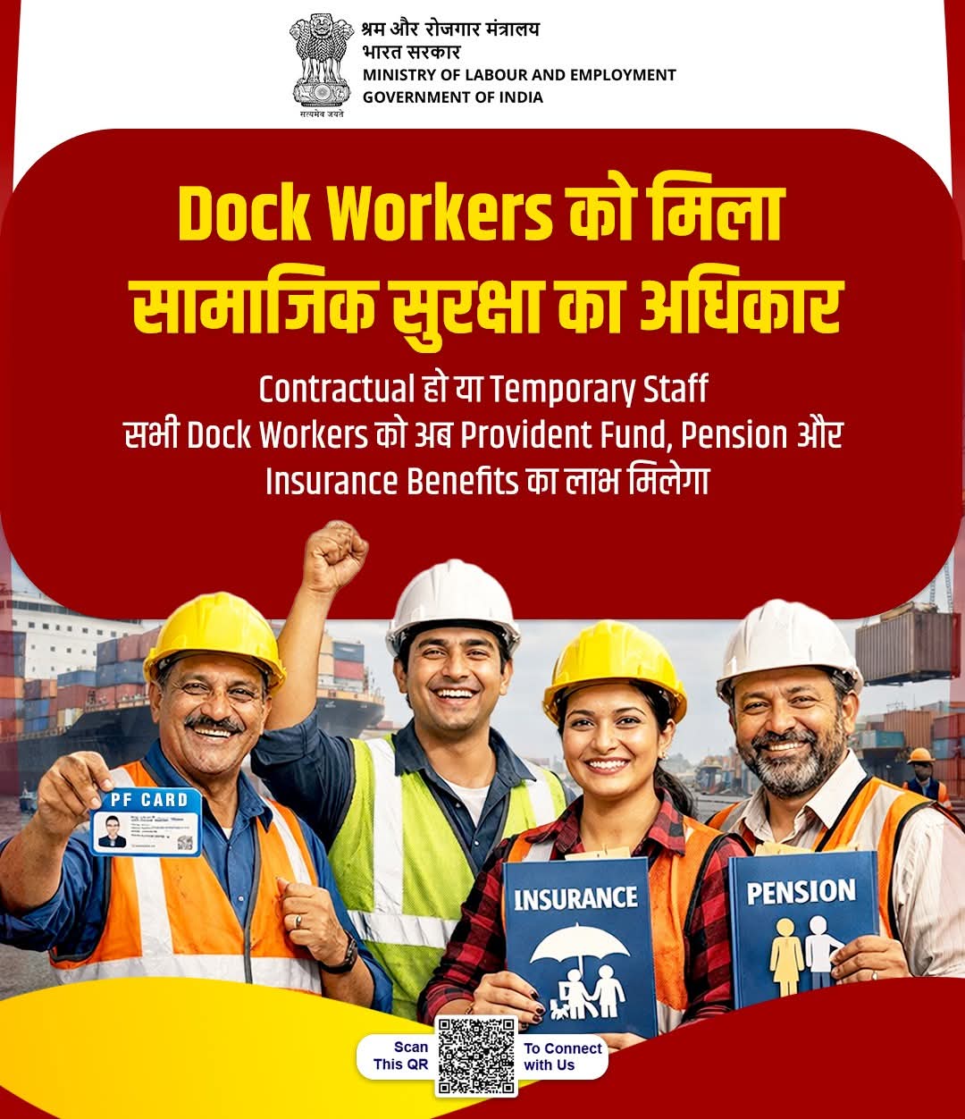 श्रम संहिताओं के तहत Dock Workers को भी सामाजिक सुरक्षा के दायरे में लाया गया है। अब Contract या Temporary Staff के रूप में कार्यरत Dock Workers को भी Provident Fund, Pension और Insurance Benefits जैसे महत्वपूर्ण लाभ प्राप्त होंगे।