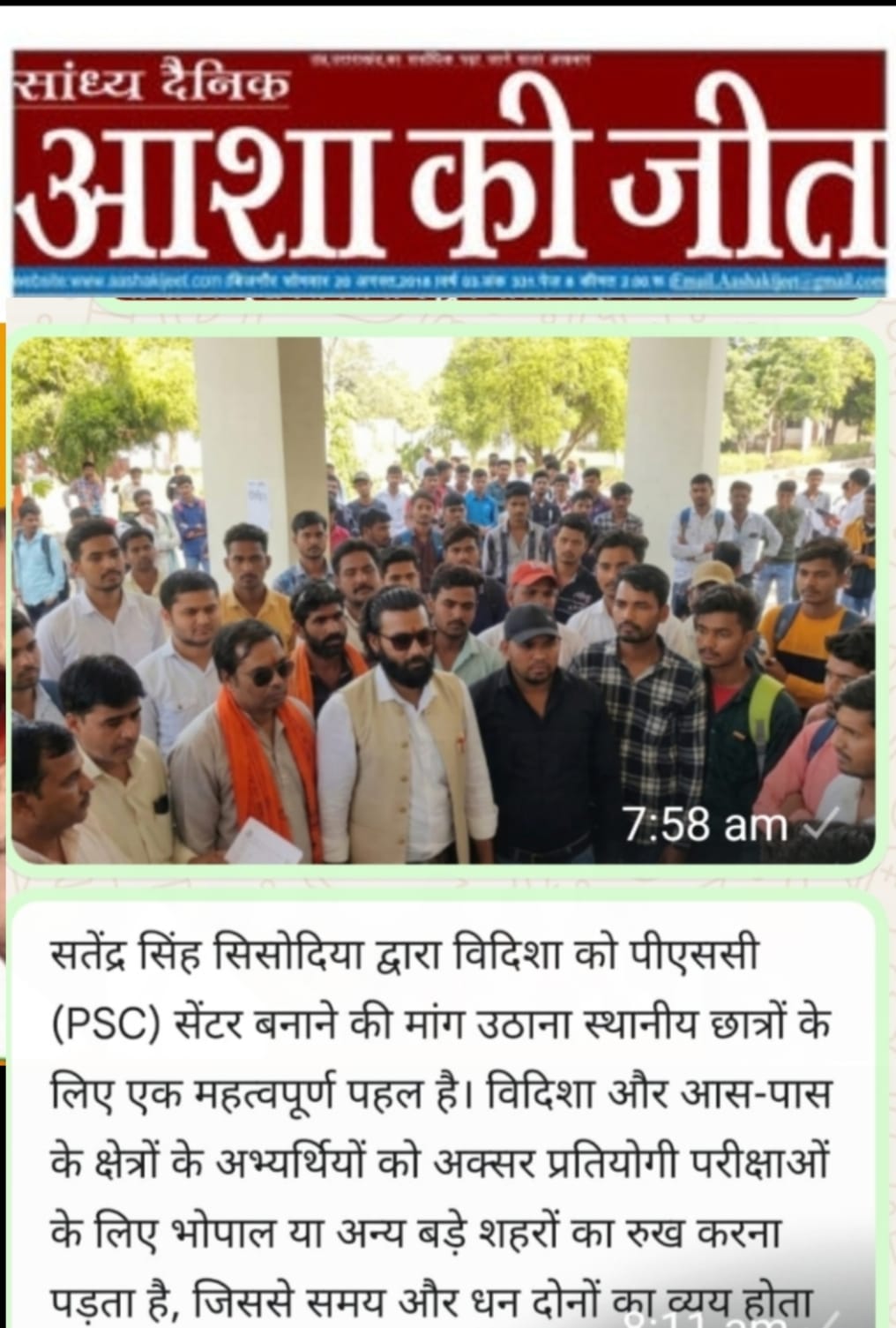 विदिशा जिले के छात्र-चो को कंपटीशन पर एग्जाम हो या किसी भी तरह की नौकरियां संबंधित परीक्षाएं जिसमें छात्रों को अपने शहर से कई किलोमीटर दूर सफर करना पड़ता है जिस कारण में समय पर परीक्षा केंद्र तक नहीं पहुंच पाते हैं और समय और पैसा दोनों ही खर्च होते हैं और शारीरिक कष्ट भी होता है इसलिए छात्र संघ और आम जनता की मांग पर विदिशा जिले में एक बड़े व्यापक स्टार परीक्षा केंद्र की मांग की गई है