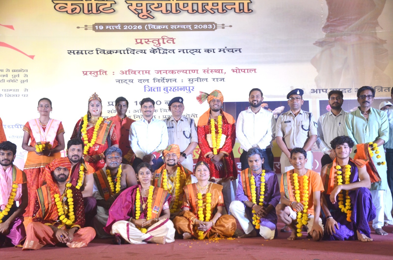 बुरहानपुर/19 मार्च, 2026/- ‘‘विक्रमोत्सव-2026’’ सृष्टि आरंभ दिवस, वर्ष प्रतिपदा विक्रम संवत् 2083 के अवसर पर जिला स्तरीय ‘‘कोटि सूर्याेपासना’’ कार्यक्रम परमानंदजी गोविंदजीवाला ऑडिटोरियम में आयोजित रहा। इस अवसर पर कलेक्टर श्री हर्ष सिंह, एसपी श्री देवेन्द्र पाटीदार, सीईओ जिला पंचायत एवं अपर कलेक्टर श्री सृजन वर्मा सहित अन्य अधिकारी-कर्मचारीगण, विद्यार्थी एवं गणमान्य नागरिकगण मौजूद रहे। कार्यक्रम का शुभारंभ माँ सरस्वती के चित्र पर माल्यार्पण एवं दीप-प्रज्जवलन कर किया गया।