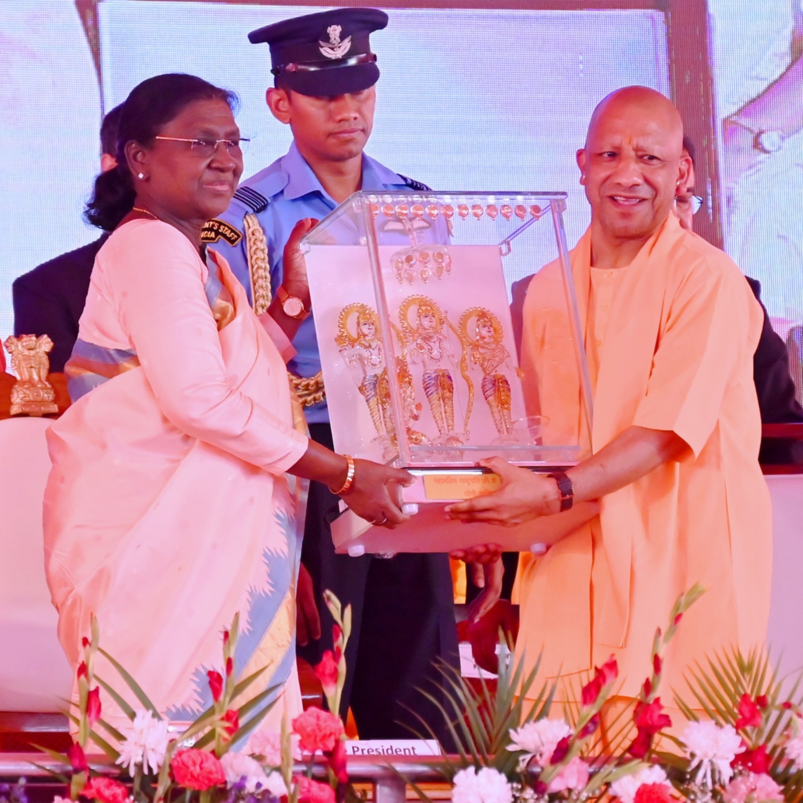 कार्यक्रम में आनंदीबेन पटेल और योगी आदित्यनाथ भी विशेष रूप से उपस्थित रहे। इस दौरान मंदिर परिसर में भक्तिमय वातावरण देखने को मिला और बड़ी संख्या में श्रद्धालुओं ने इस दिव्य क्षण के साक्षी बने।