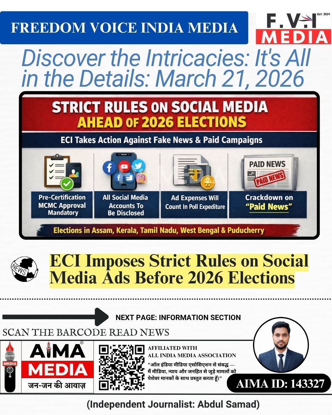 ECI ne paid news ke khilaf bhi sakht stance liya hai aur MCMC ko nigrani badhane ke liye kaha hai. Yeh faisla Assam, Kerala, Puducherry, Tamil Nadu aur West Bengal mein hone wale elections se pehle liya gaya hai.