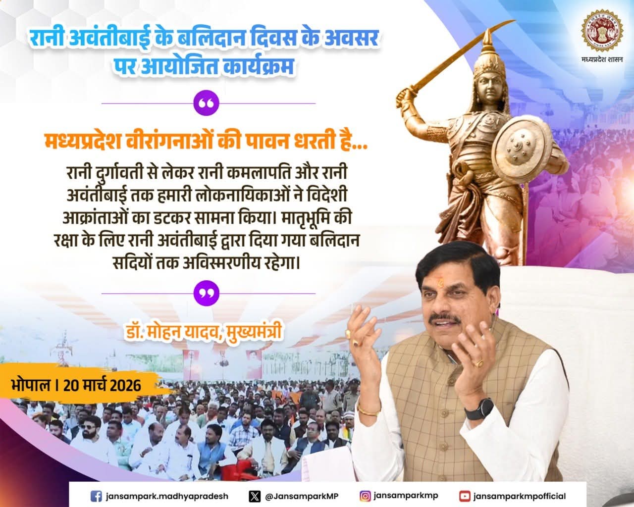 रानी दुर्गावती से लेकर रानी कमलापति और रानी अवंतीबाई तक हमारी लोकनायिकाओं ने विदेशी आक्रांताओं का डटकर सामना किया। मातृभूमि की रक्षा के लिए रानी अवंतीबाई द्वारा दिया गया बलिदान सदियों तक अविस्मरणीय रहेगा।