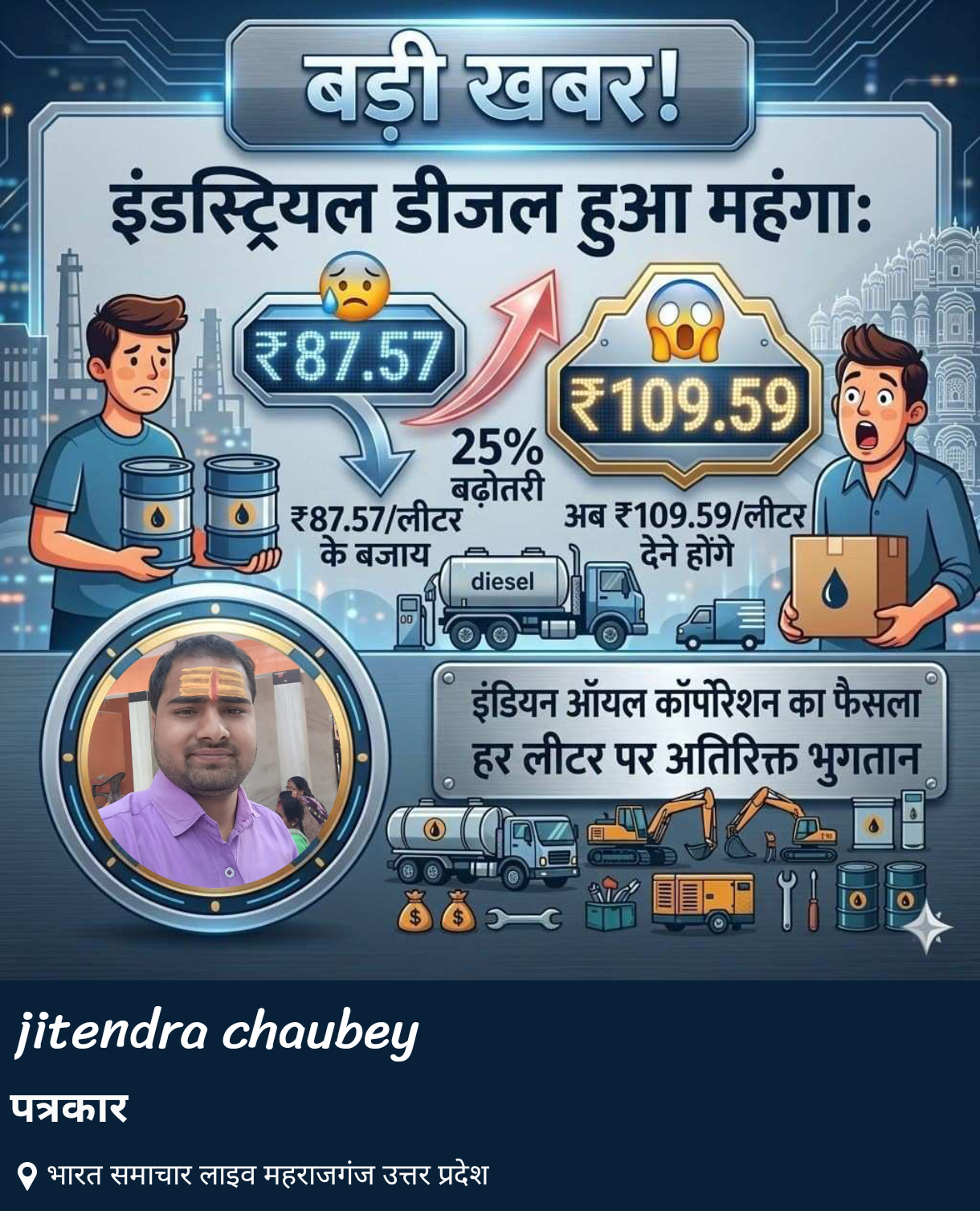 मिडिल ईस्ट में बढ़ते तनाव और कच्चे तेल की कीमतों में तेजी के चलते भारत में इंडस्ट्रियल डीजल की कीमत में भारी बढ़ोतरी हुई है। इसकी कीमत 87.67 रुपये से बढ़ाकर 109.59 रुपये प्रति लीटर कर दी गई है, यानी करीब 21.92 रुपये (लगभग 25%) की बढ़ोतरी। यह नई कीमतें तुरंत लागू हो गई हैं।