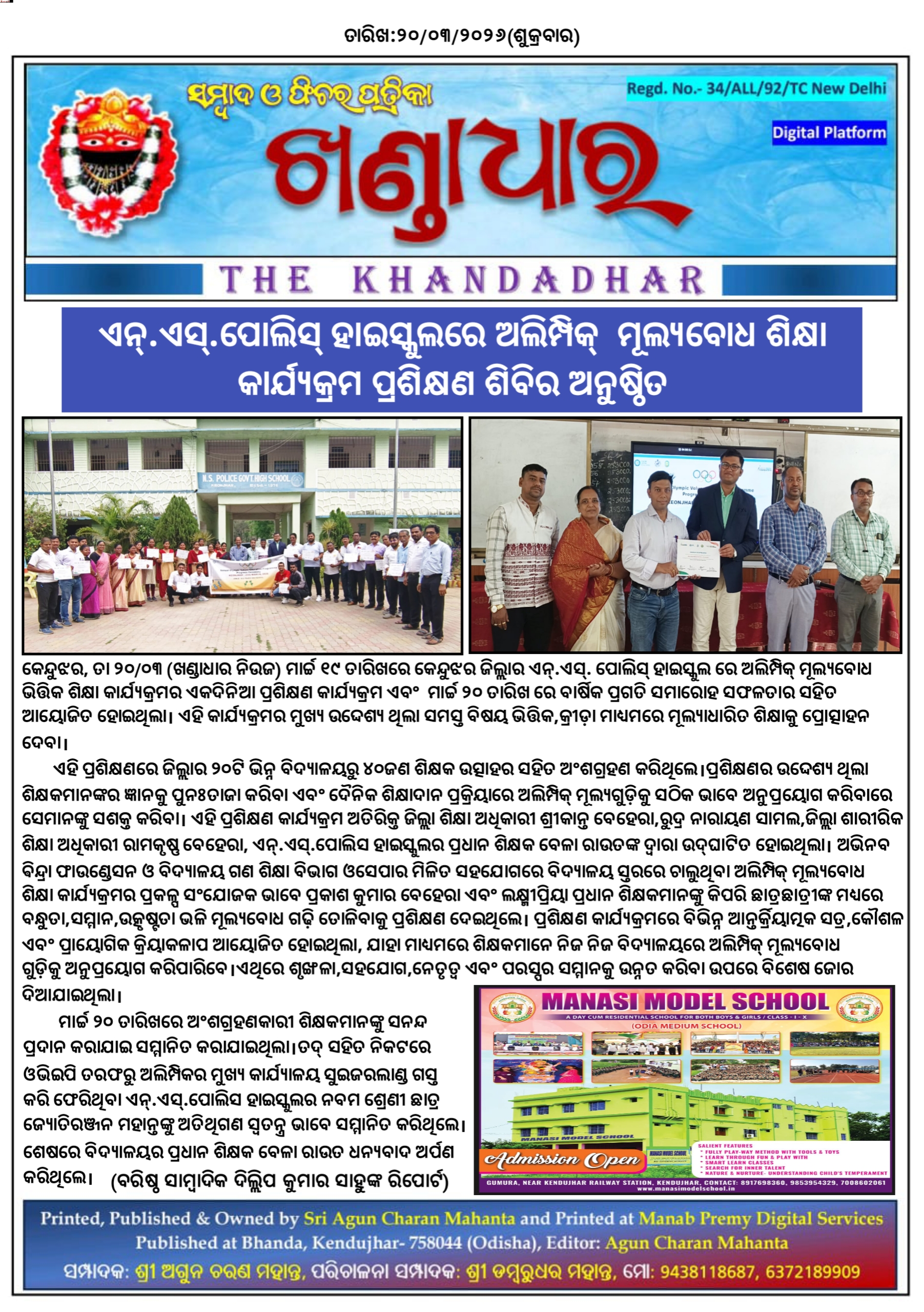 କେନ୍ଦୁଝର,ତା ୨୦/୩-ମାର୍ଚ୍ଚ ୧୯ ତାରିଖରେ କେନ୍ଦୁଝର ଜିଲ୍ଲାର ଏନ୍‌.ଏସ୍‌. ପୋଲିସ୍‌ ହାଇସ୍କୁଲରେ ଅଲିମ୍ପିକ୍ ମୂଲ୍ୟବୋଧ ଭିତ୍ତିକ ଶିକ୍ଷା କାର୍ଯ୍ୟକ୍ରମର ଏକଦିନିଆ ପ୍ରଶିକ୍ଷଣ କାର୍ଯ୍ୟକ୍ରମ ଏବଂ ମାର୍ଚ୍ଚ ୨୦ ତାରିଖ ରେ ବାର୍ଷିକ ପ୍ରଗତି ସମାରୋହ ସଫଳତାର ସହିତ ଆୟୋଜିତ ହୋଇଥିଲା।ଏହି କାର୍ଯ୍ୟକ୍ରମର ମୁଖ୍ୟ ଉଦ୍ଦେଶ୍ୟ ଥିଲା ସମସ୍ତ ବିଷୟ ଭିତ୍ତିକ,କ୍ରୀଡ଼ା ମାଧ୍ୟମରେ ମୂଲ୍ୟାଧାରିତ ଶିକ୍ଷାକୁ ପ୍ରୋତ୍ସାହନ ଦେବା।